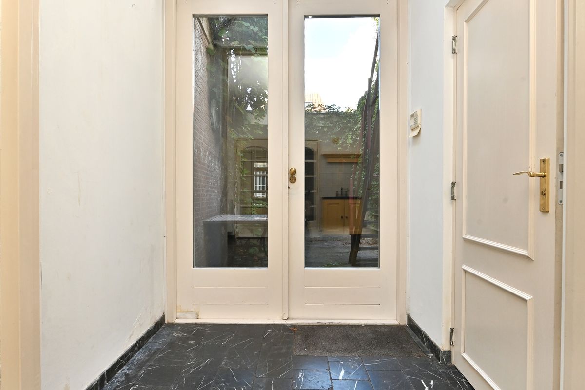 De tuin is fraai aangelegd, biedt volop privacy en geeft toegang tot de achterliggende vrijstaande garage — een zeldzaamheid in het centrum.