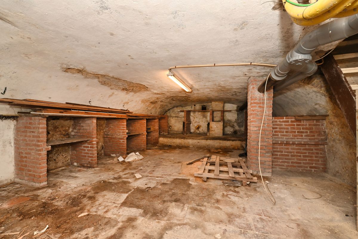 De woonkamer is afgewerkt met een klassieke visgraat vloer, strakke stucwerkwanden en plafond, en beschikt over een volledig functionerende open haard. Via de woonkamer is er toegang tot de keuken en de kelder — ideaal als extra provisie- of wijnruimte.