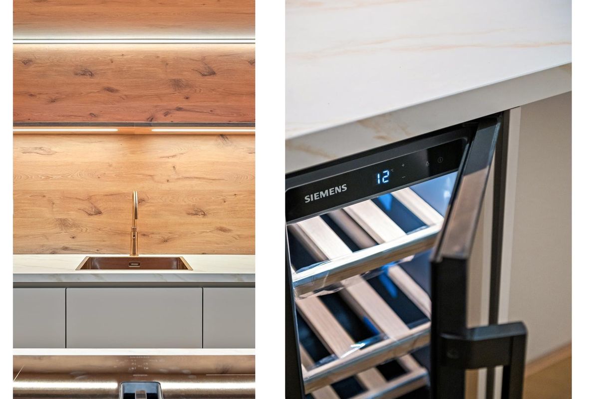 The modern kitchen is fully equipped with Siemens built-in appliances: combination microwave, oven, induction hob with integrated extractor, fridge-freezer, dishwasher, Quooker tap, and wine cooler. Sleek handleless cabinets provide a stylish look and plenty of storage space.