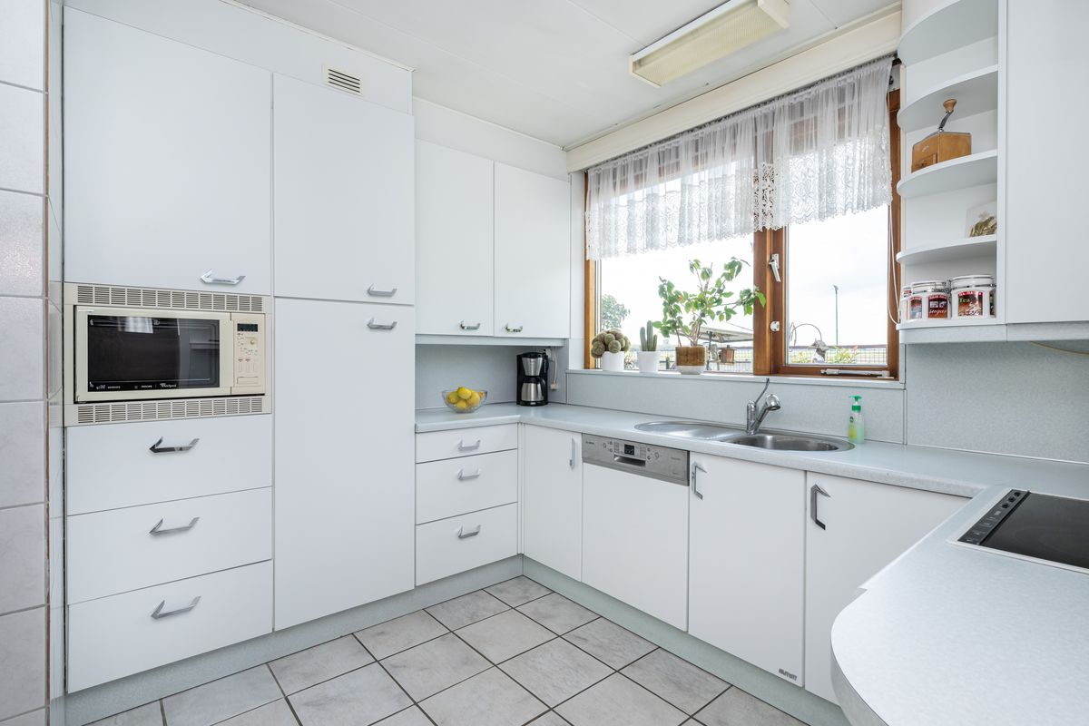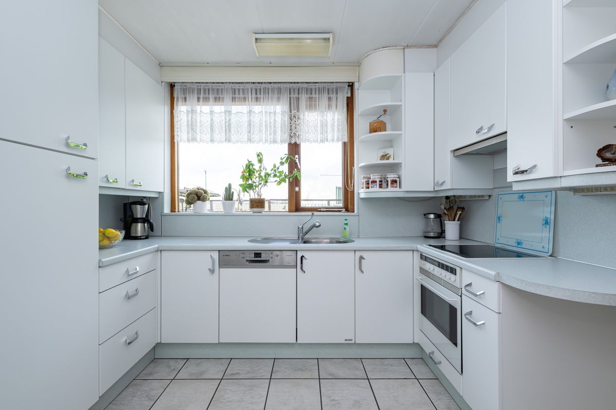 Plavuizenvloer, 4-pits keramische kookplaat, afzuigkap, enkele spoelbak, elektrische oven, magnetron, koelkast en een vaatwasser.