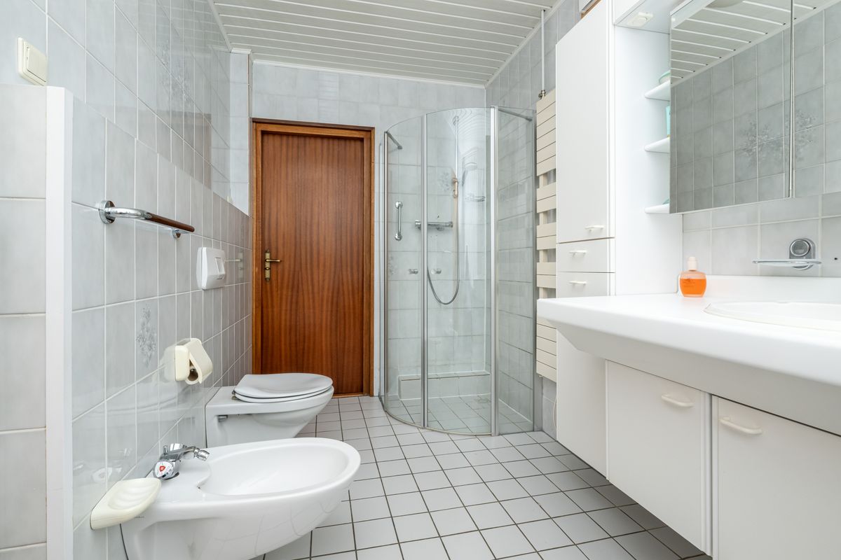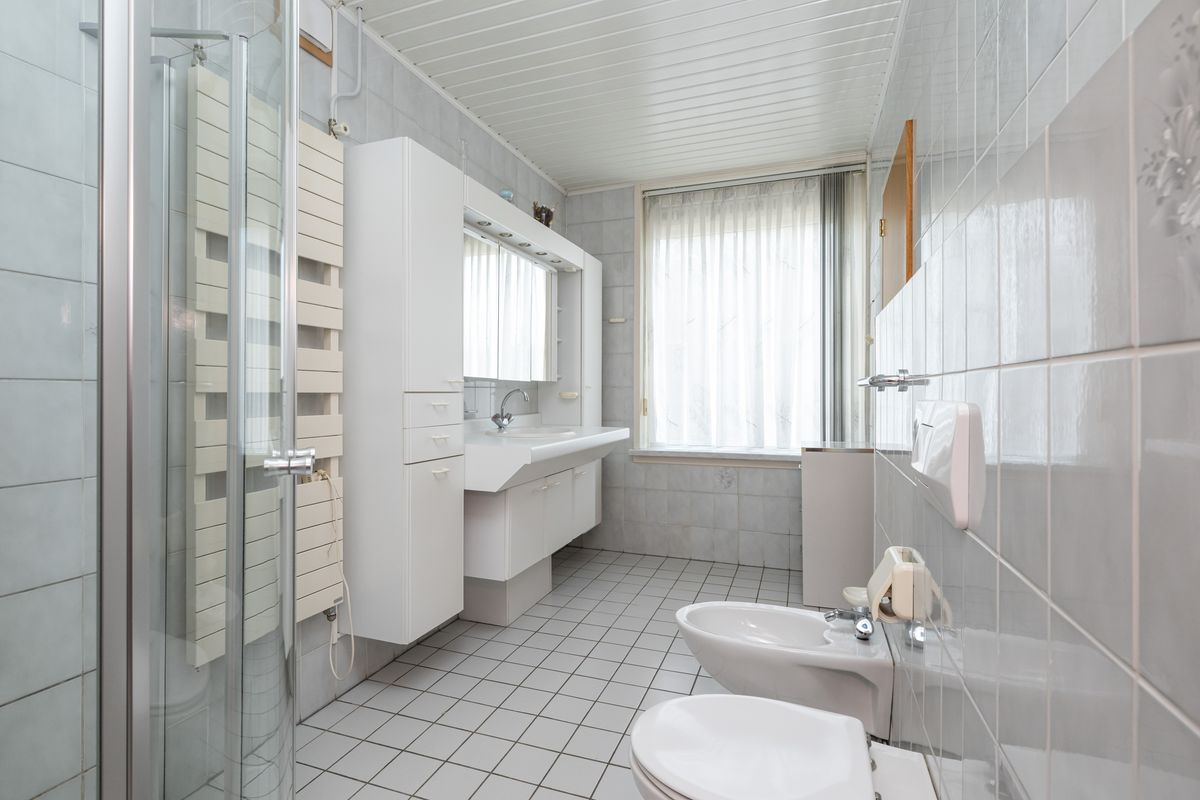 Plavuizenvloer, geheel betegeld, douche cabine, handdoekenradiator, wastafel met meubel, elektrisch rolluik, zwevend toilet, bidet, kunststof kozijn en elektrische afzuiging.