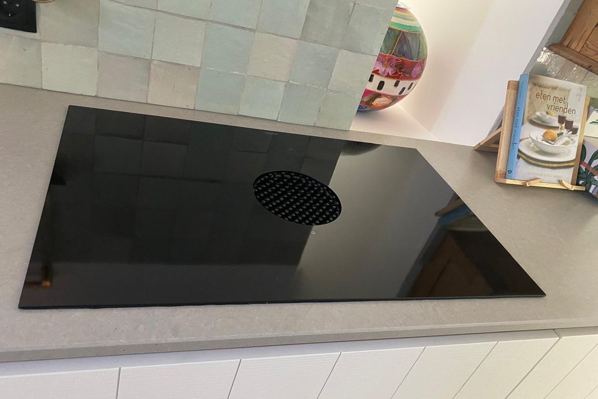 Open keuken met luxe hoekopstelling (2022) met composiet blad en inbouwapparatuur.