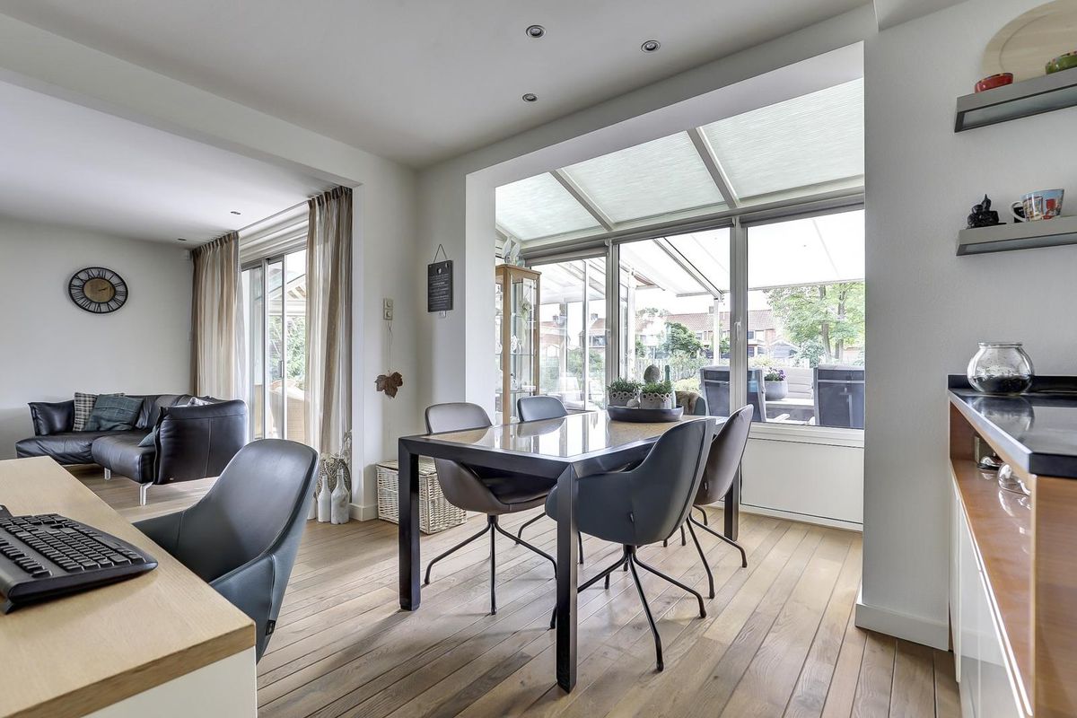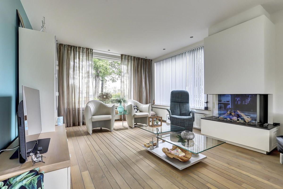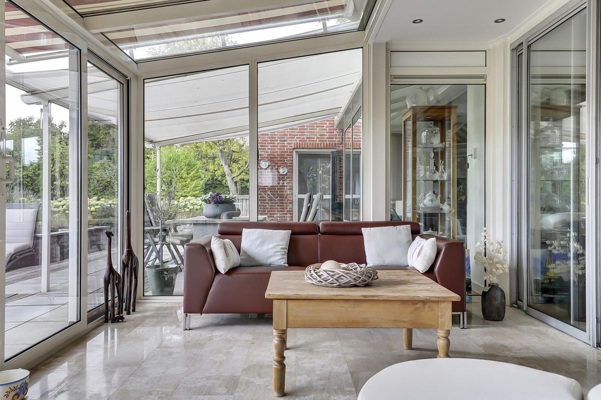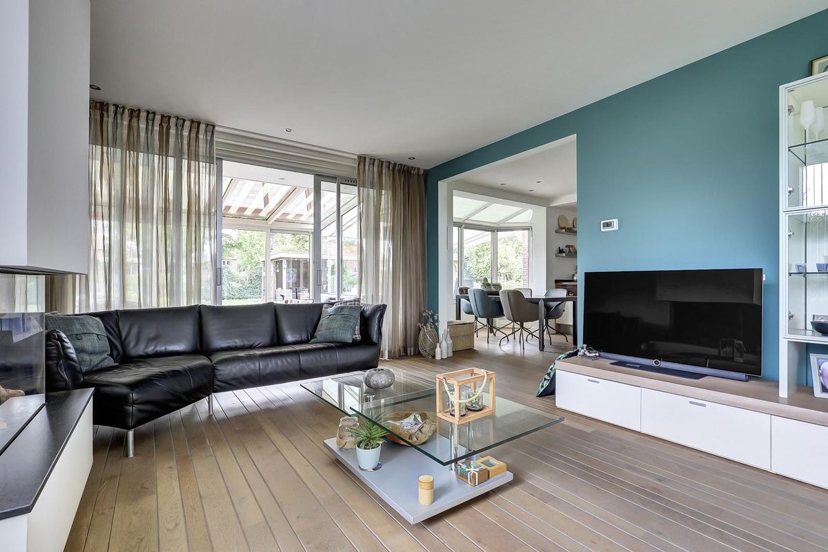 De lichte woonkamer beschikt over een fraaie gashaard en grote raampartijen die zorgen voor veel natuurlijk licht en een prettige sfeer. Vanuit de woonkamer bereikt u de serre: een heerlijke plek om het hele jaar door te genieten van de tuin, dankzij de grote glazen schuifpuien en het uitzicht op het groen.