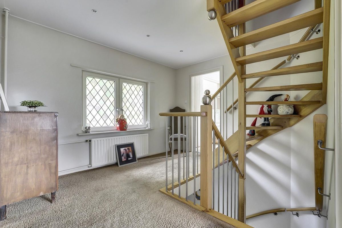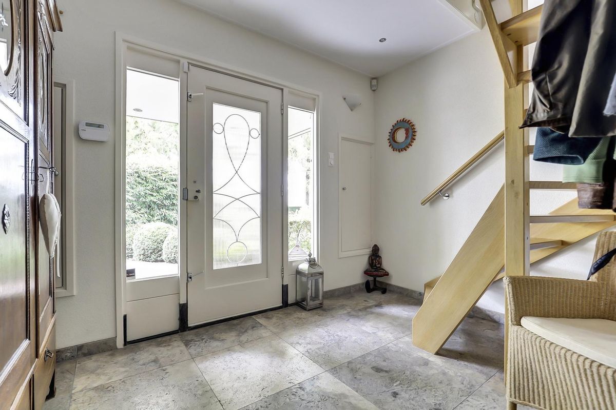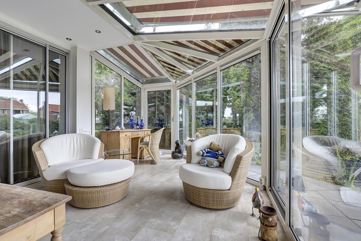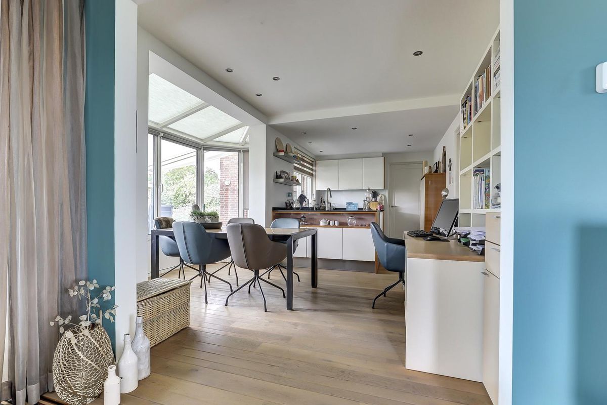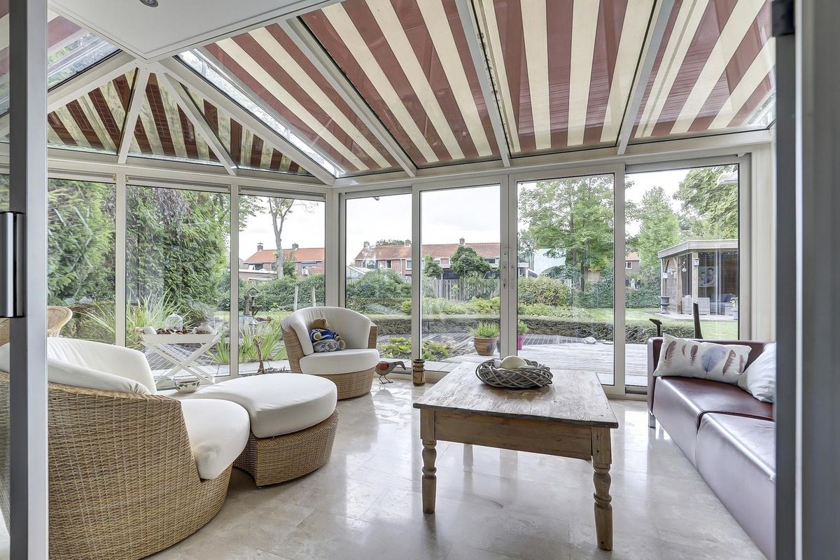 De lichte woonkamer beschikt over een fraaie gashaard en grote raampartijen die zorgen voor veel natuurlijk licht en een prettige sfeer. Vanuit de woonkamer bereikt u de serre: een heerlijke plek om het hele jaar door te genieten van de tuin, dankzij de grote glazen schuifpuien en het uitzicht op het groen.