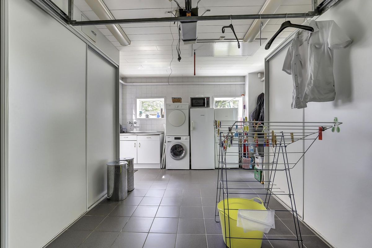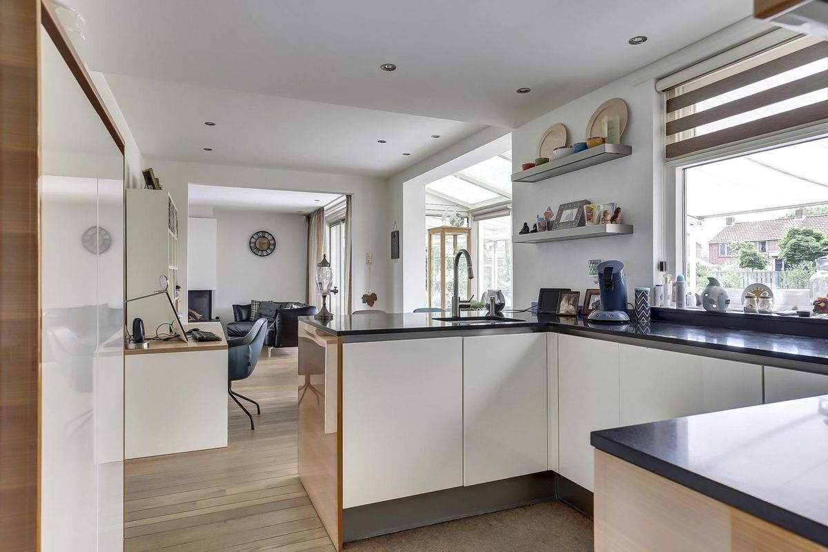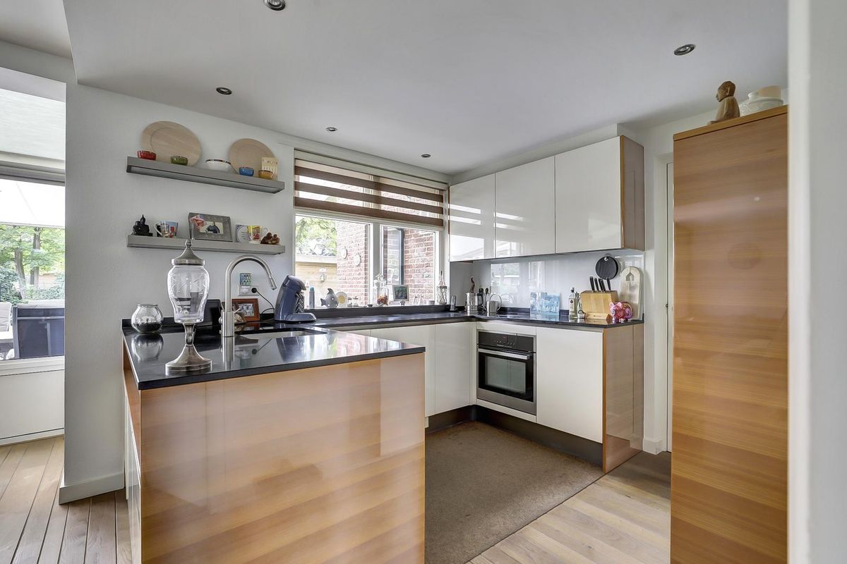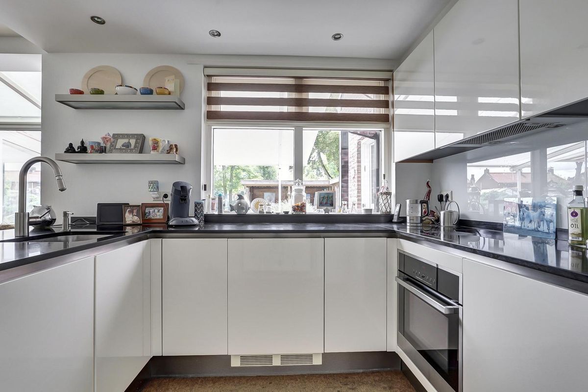 De keuken is modern uitgevoerd met hoogglans kasten, een donker werkblad en diverse inbouwapparatuur, waaronder een oven, keramische kookplaat met afzuigkap, vaatwasser en een spoelbak met kraan. Vanuit de keuken bereikt u de bijkeuken en de garage, waar tevens ruimte is voor de wasmachine en droger.