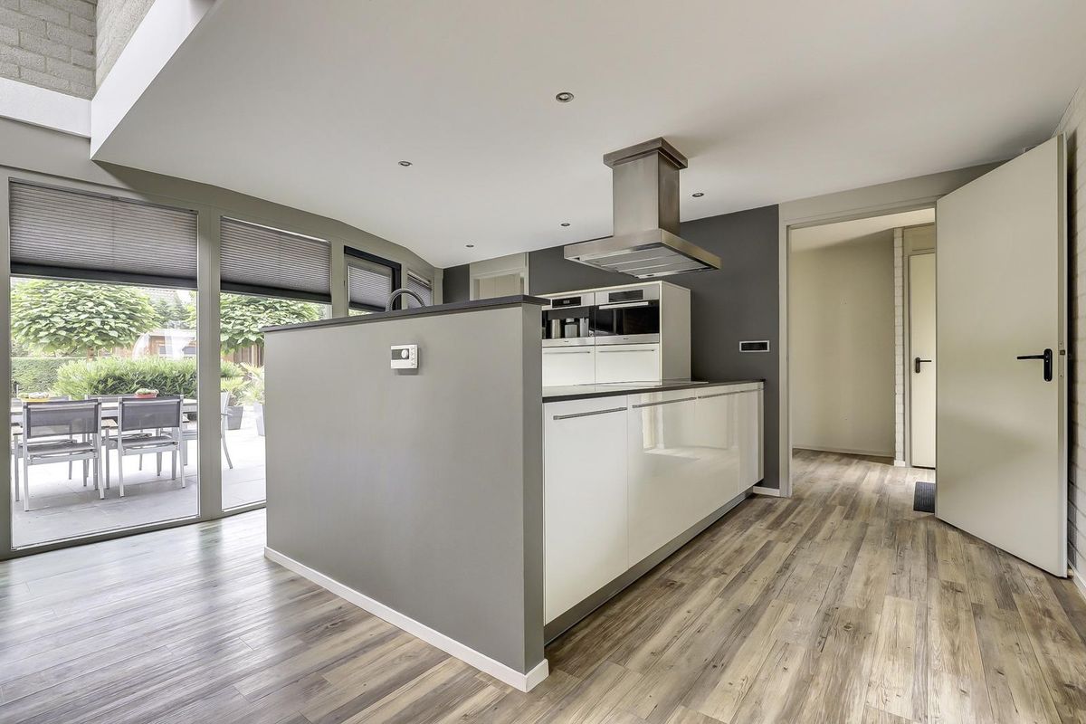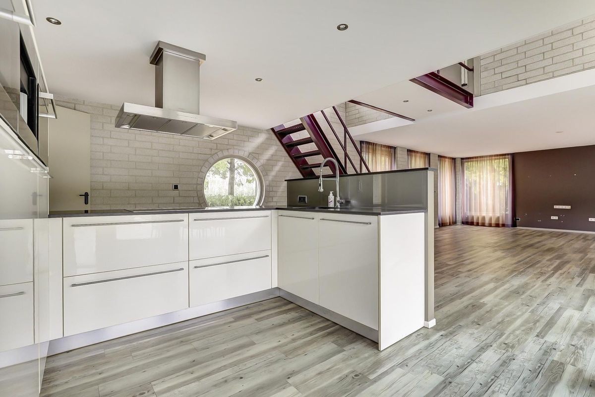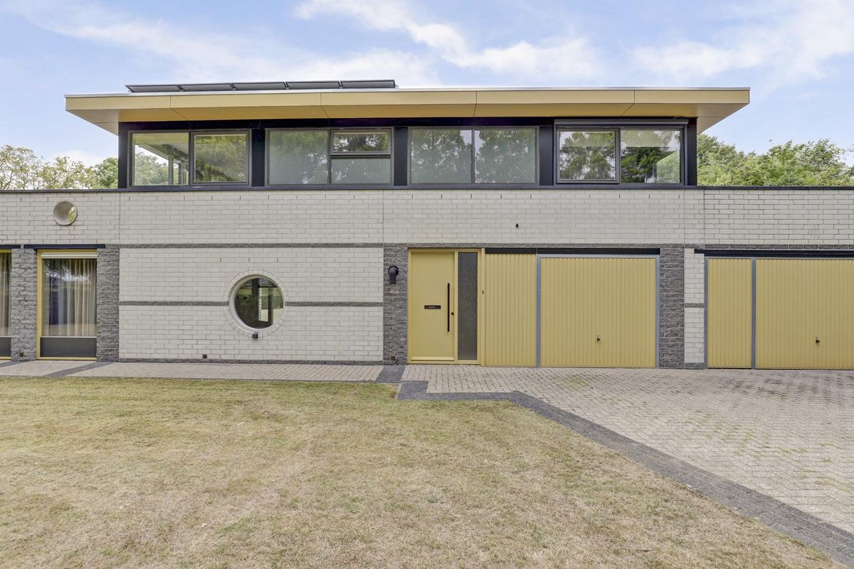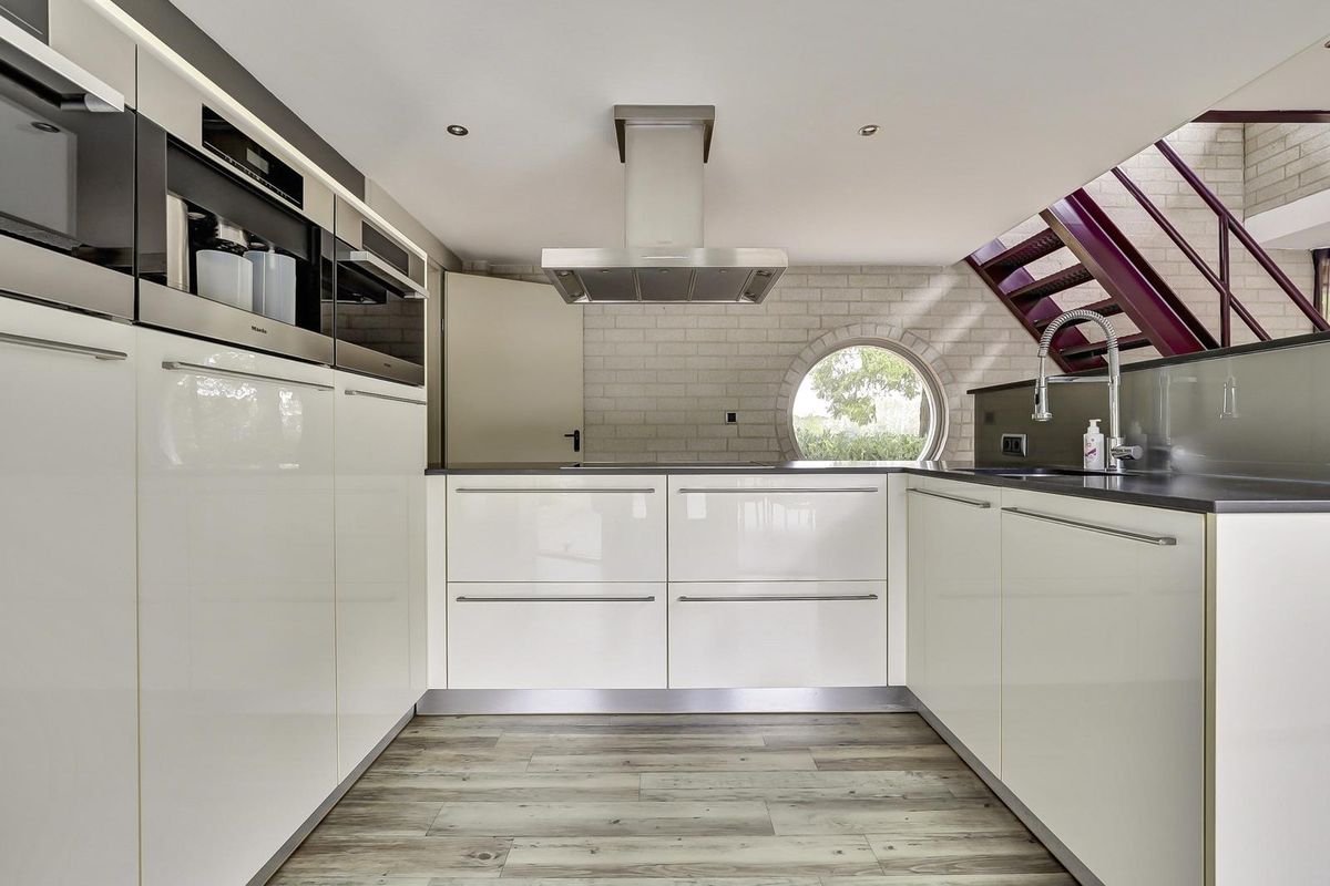 Bij aankomst valt de strakke gevel met de ronde raampartij en de gele accenten direct op. U komt binnen via de hal met garderobe, meterkast en separaat toilet. Vanuit hier betreedt u de keuken en de ruimtelijke woonkamer met een prachtige lichtinval dankzij de vele hoge ramen. De kamer is afgewerkt met een lichte vloer. De woonkamer staat in open verbinding met de keuken in U-opstelling. De keuken is voorzien van diverse inbouwapparatuur, waaronder twee combi-ovens, magnetron, koelkast, vaatwasser en inductiekookplaat met afzuigkap, en is uitgevoerd met hoogglans kasten. Vanuit de keuken bereikt u bovendien een tweede hal, van waaruit u direct toegang heeft tot de twee inpandige garages. Het ronde raam in de keuken blijft een sfeervol element dat u eenvoudig in een nieuwe inrichting kunt integreren. De open trap met stalen afwerking vormt een eyecatcher, maar kan met een nieuwe kleur of bekleding beter aansluiten bij een modern en gezellig interieur. Vanuit de woonkamer is er toegang tot de tuin via openslaande deuren.