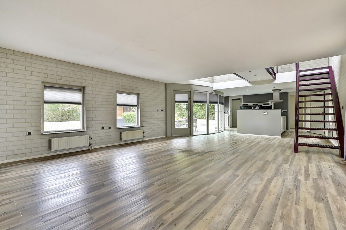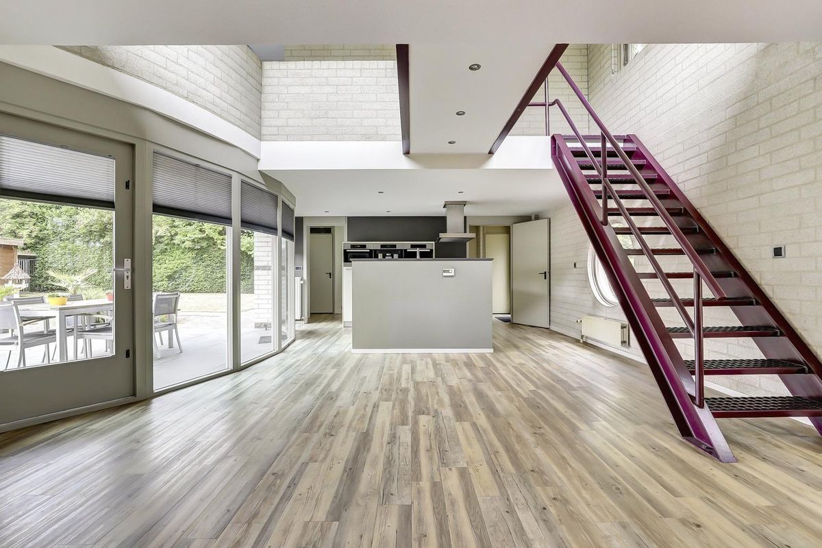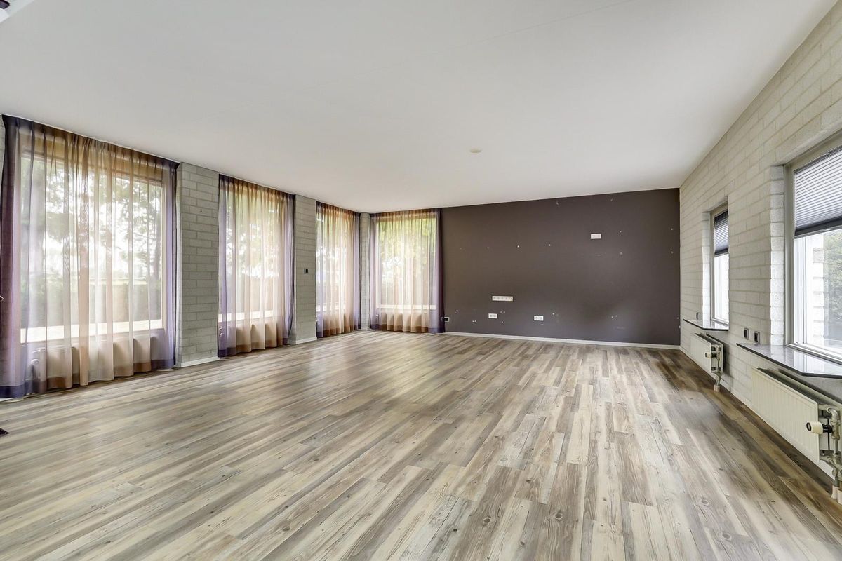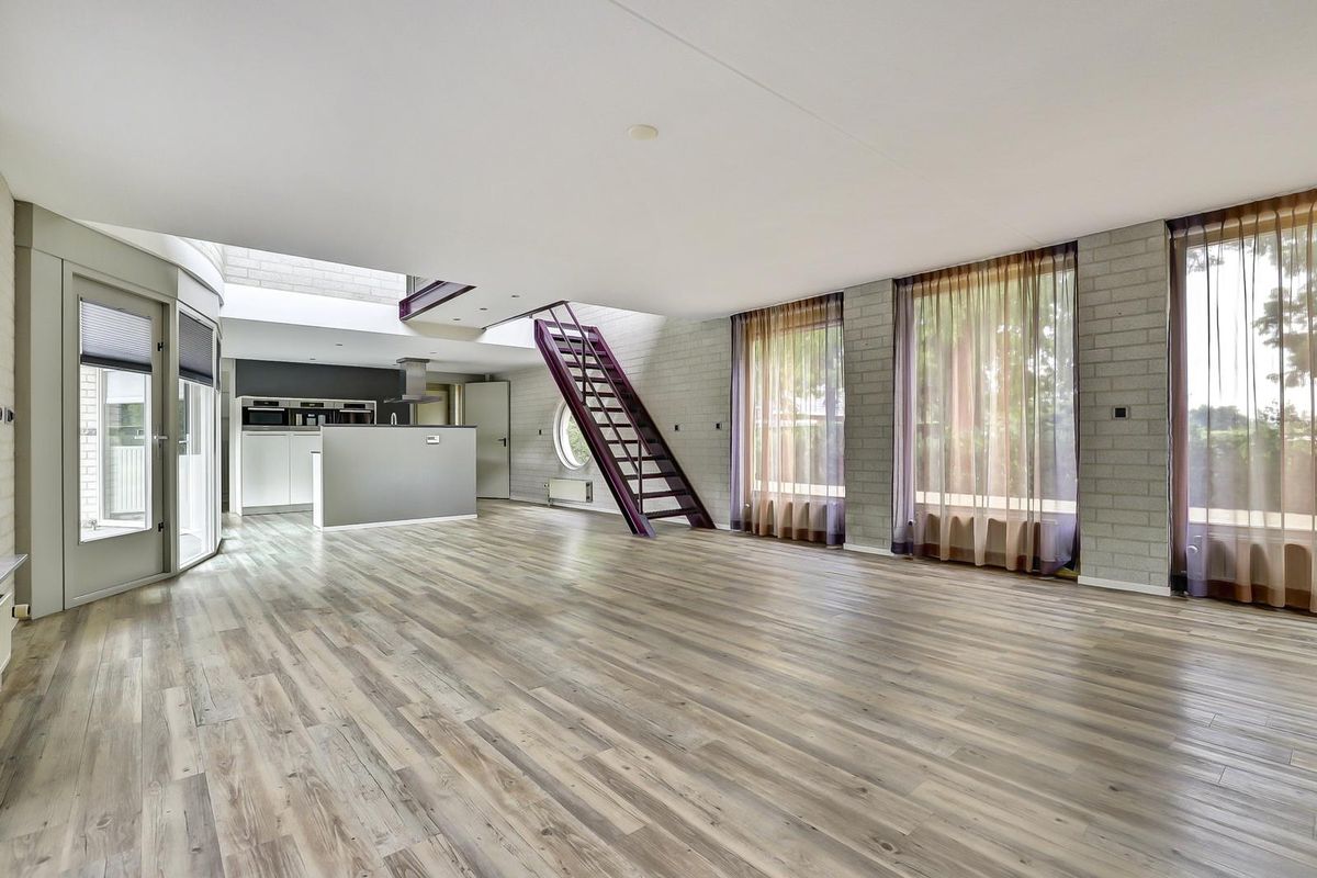 • Grote, lichte woonkamer met veel raampartijen en open verbinding naar de keuken.