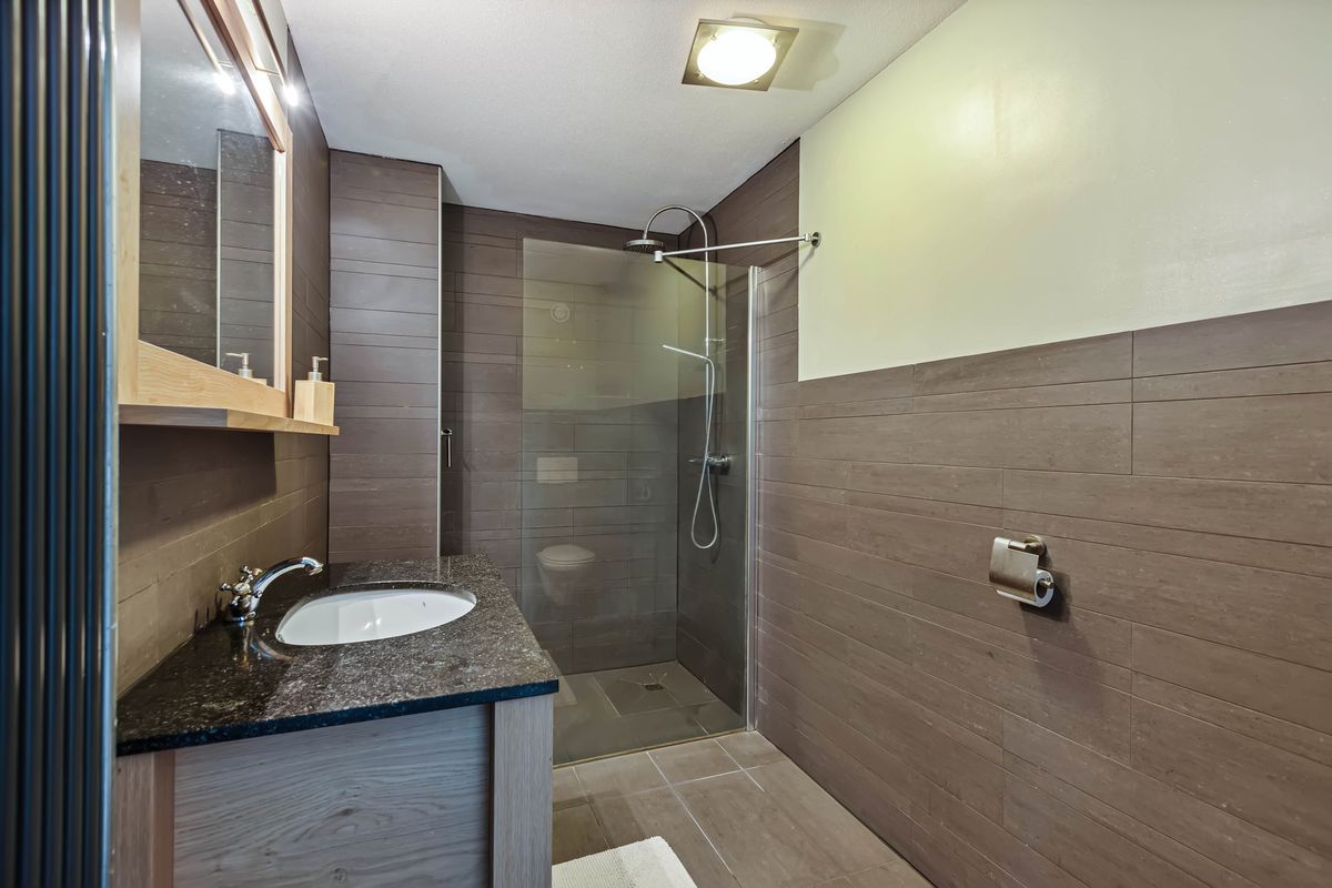 Tussen de kamers in ligt de badkamer. Deze dateert uit 2011 en straalt nog altijd luxe uit. De bruintinten, het natuurstenen blad op het wastafelmeubel en de inloopdouche geven de ruimte een warme, tijdloze uitstraling. Er is een tweede toilet, een wastafelmeubel met veel bergruimte en plek voor handdoeken en accessoires. Alles voelt verzorgd en in balans.