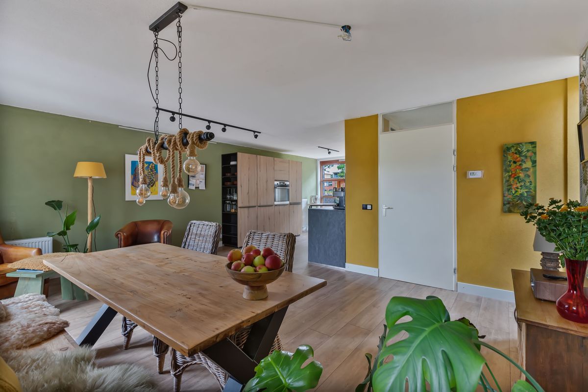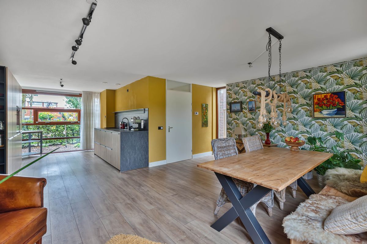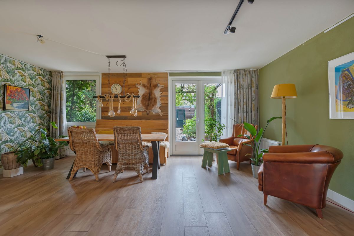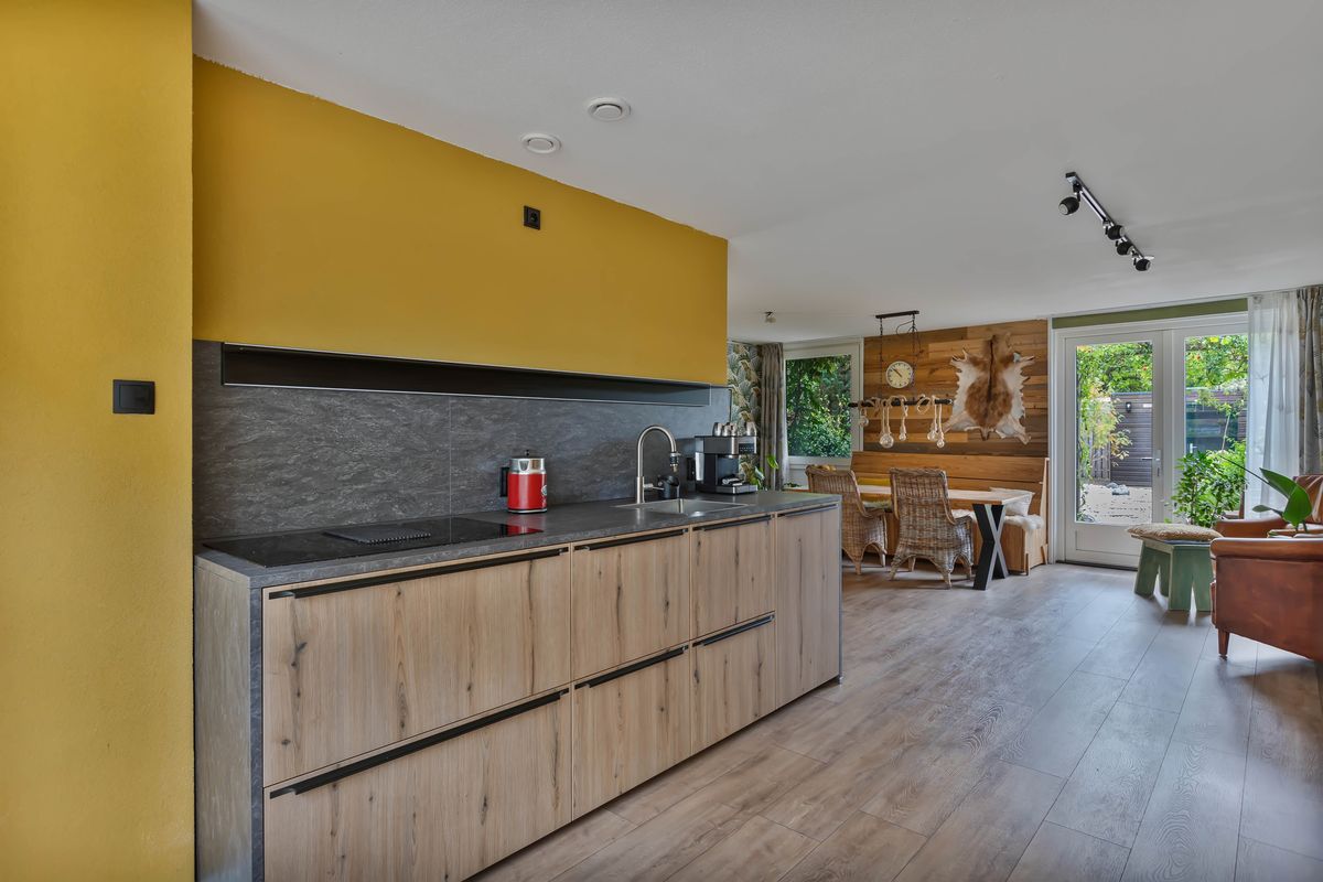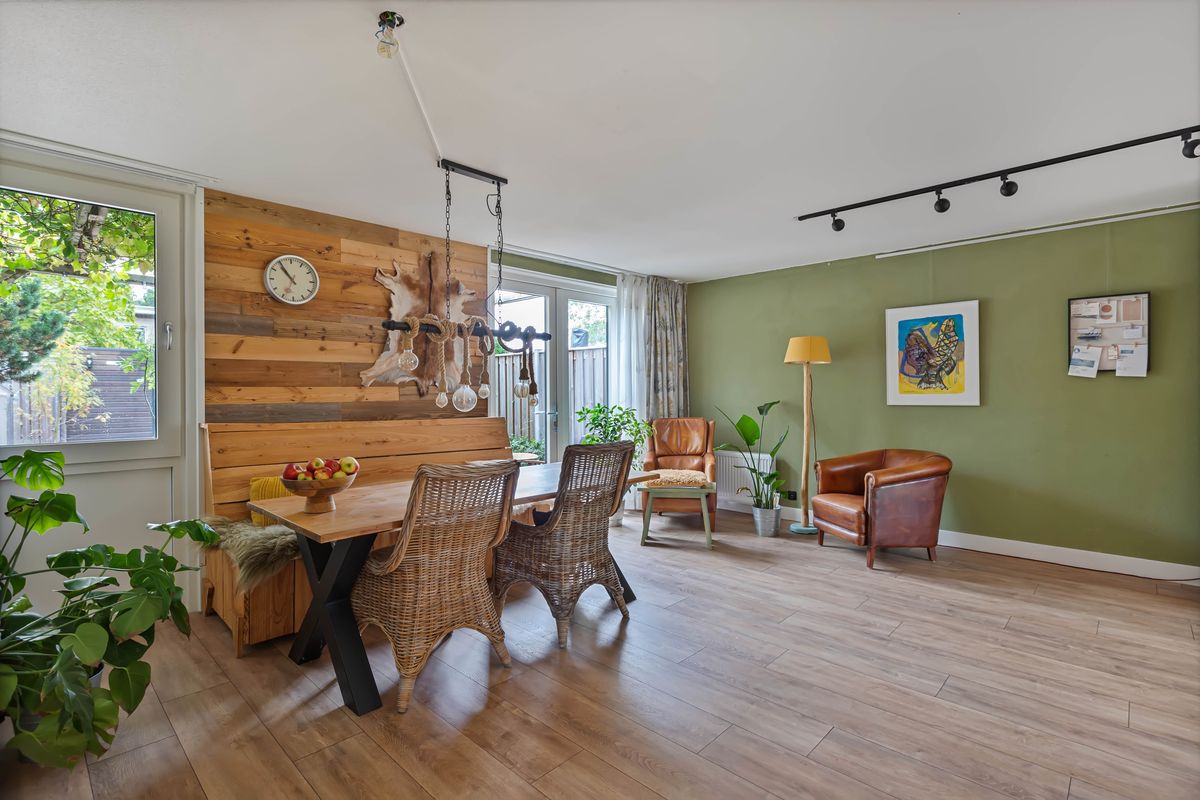Loop je door, dan kom je in een verrassend grote ruimte met aan de achterzijde de eetkamer die uitkijkt op en toegang heeft tot de tuin. De bijna nieuwe keuken (2024) is een echte blikvanger. Eigentijds en stoer. met fronten in een warme houttint, een werkblad in antraciet grijs en een bijzondere opstelling aan weerszijde van de ruimte. Aan de ene kant kook je en is het spoelgedeelte, terwijl aan de andere zijde een hoge kastenwand zorgt voor veel opbergruimte en inbouwapparatuur die deze keuken van alle gemakken voorziet. Het raam over de volle breedte en hoogte is vrijgelaten, zodat je tijdens het koken vrij uitkijkt over de voortuin en de straat. Alles klopt hier: van de oven en koel-vriescombinatie tot de strakke afwerking. Een keuken die niet alleen functioneel is, maar vooral uitnodigt tot samenzijn, waar gekookt, geproefd en gepraat wordt.