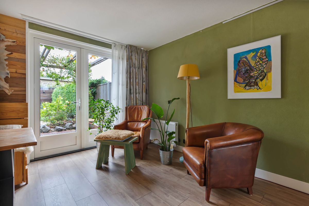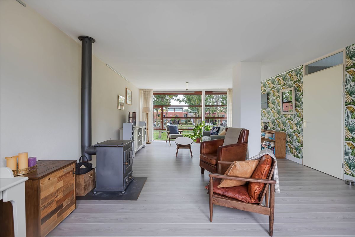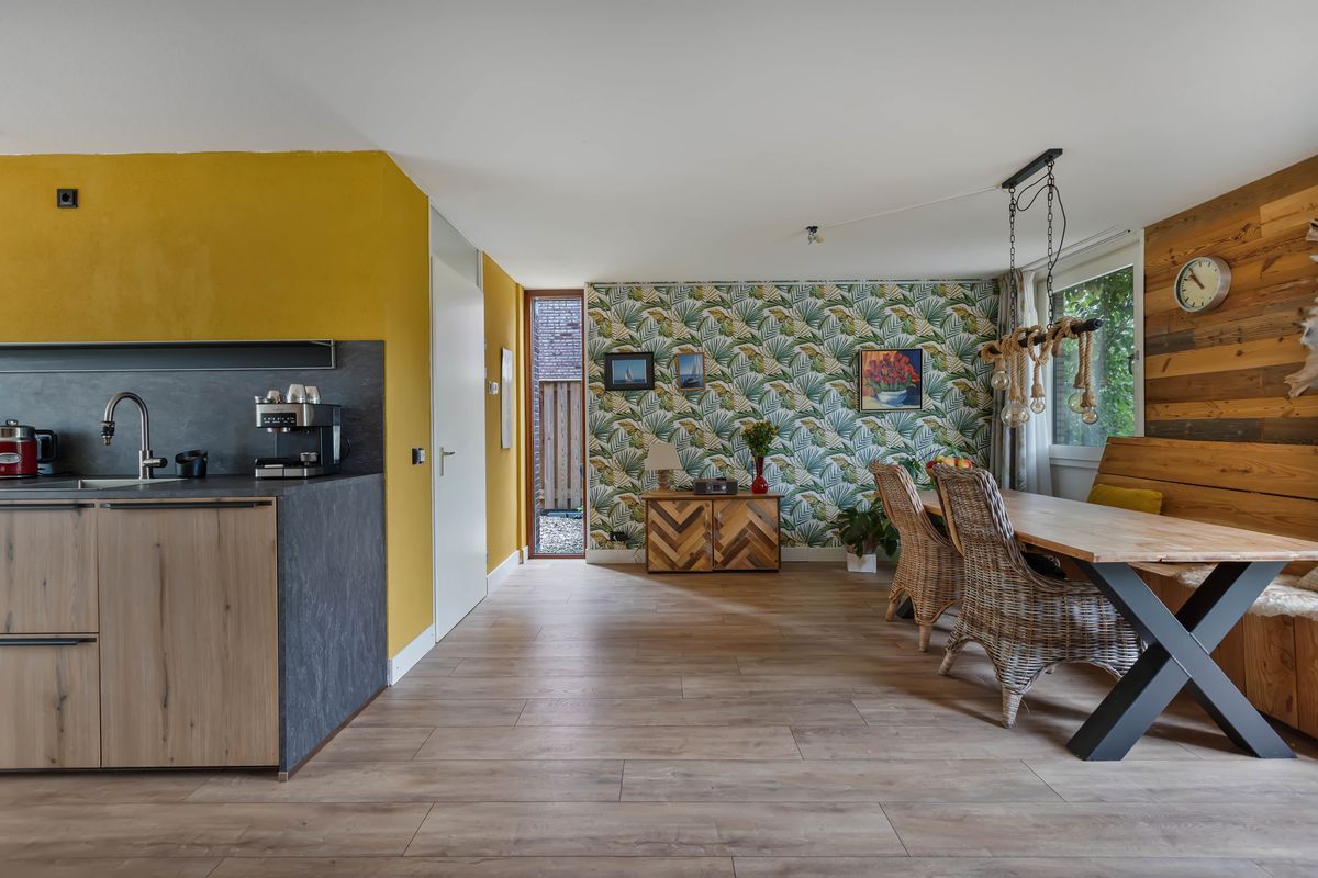 De woning combineert ruimte met sfeer, en licht met rust. Binnen lopen de kleuren, materialen en vormen harmonieus in elkaar over: een moderne keuken met houten fronten, een woonkamer met een vleug creativiteit en een houtkachel die elke avond uitnodigt tot samenzijn. Buiten wacht een tuin die voelt als een kleine oase, met een pergola die zomers voor beschutting zorgt, een kas en plek voor wie wil zaaien, oogsten of gewoon wil genieten van de stilte.