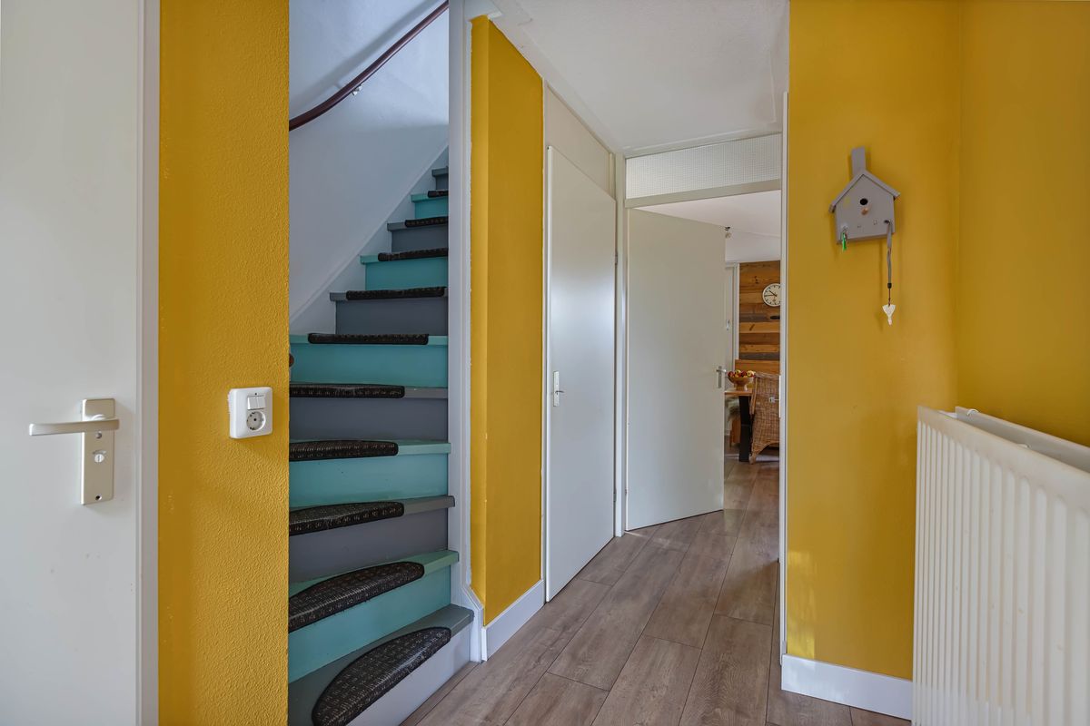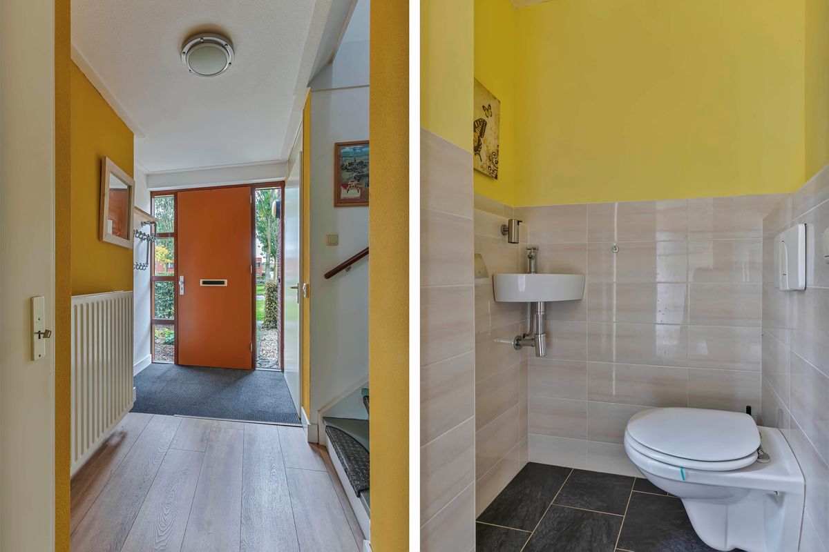 Nog vóór je de sleutel in het slot steekt, voel je het al. De recht opgaande gevel met glazen pui geeft je een sneak preview van wat er achter de voordeur van deze hoekwoning schuilgaat. De entree is praktisch ingedeeld met toilet, meterkast en trapkast. Een goede basis. De laminaatvloer in warme houttint en de kleuraccenten geven dit begin van de woning gelijk die persoonlijke touch.