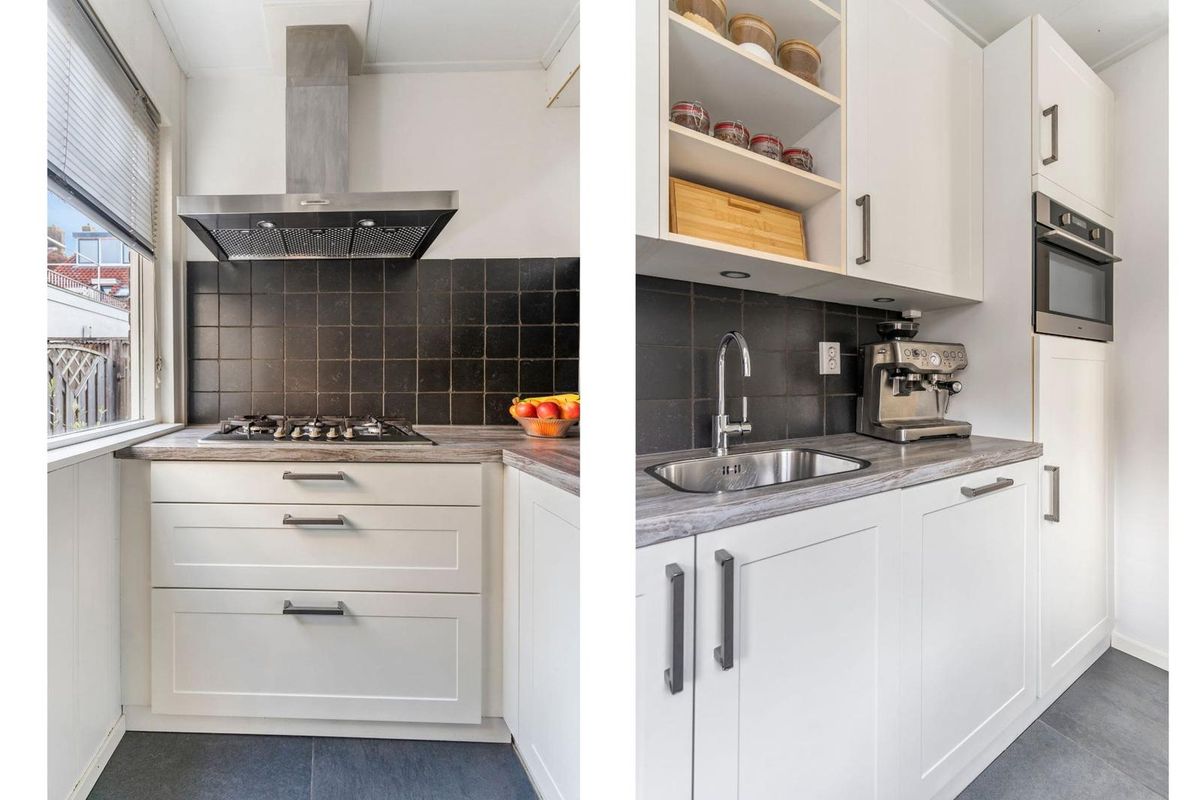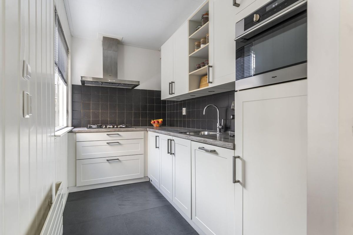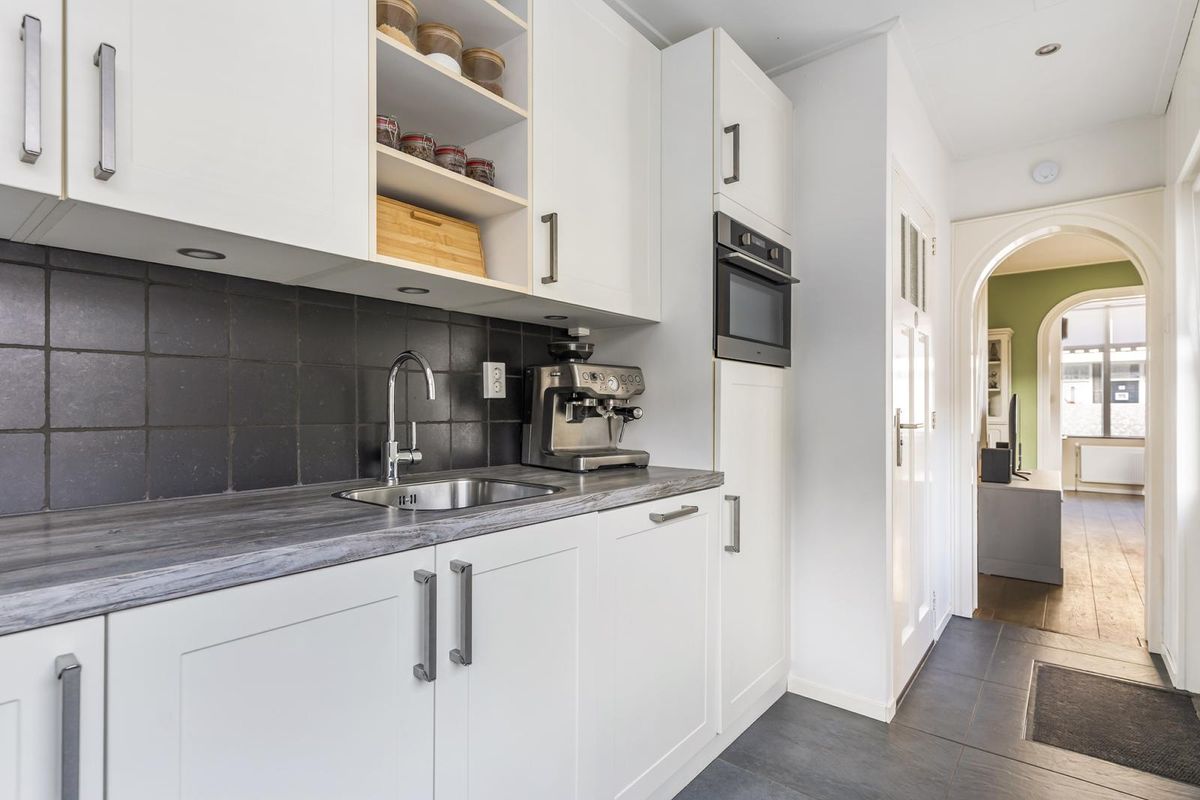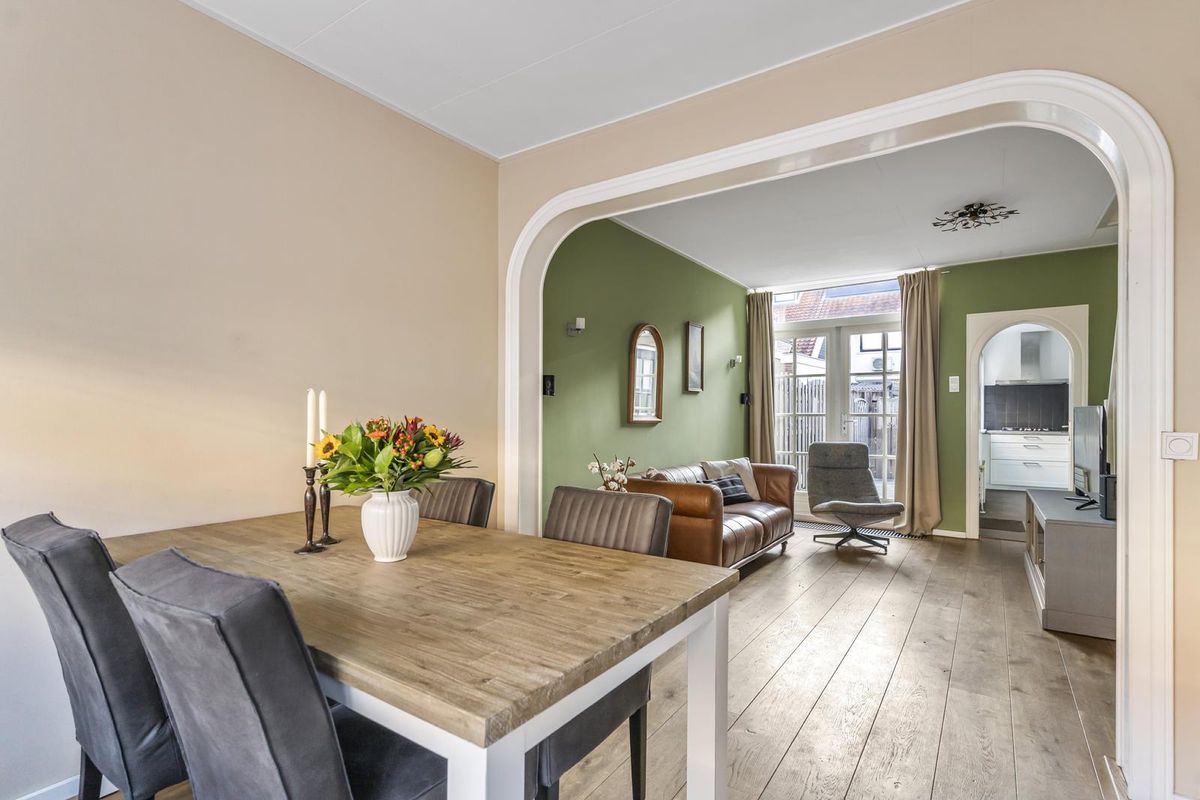 De woonkamer ademt de charme van de jaren ’30, met een sfeervolle erker aan de voorzijde en openslaande deuren naar de tuin aan de achterzijde. De ruime, lichte indeling maakt het een plek waar je direct wilt neerploffen. De moderne keuken sluit hier perfect op aan en is uitgevoerd in een tijdloze stijl met houtlook werkblad en diverse inbouwapparatuur.