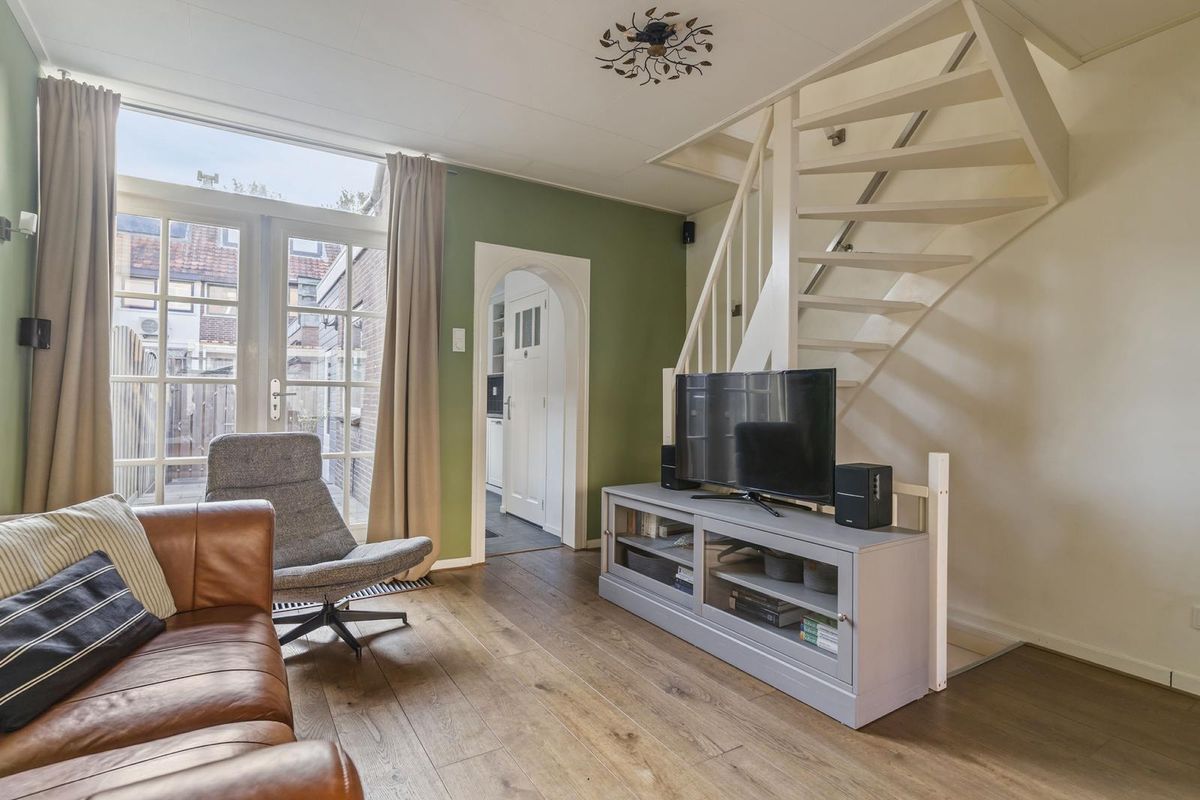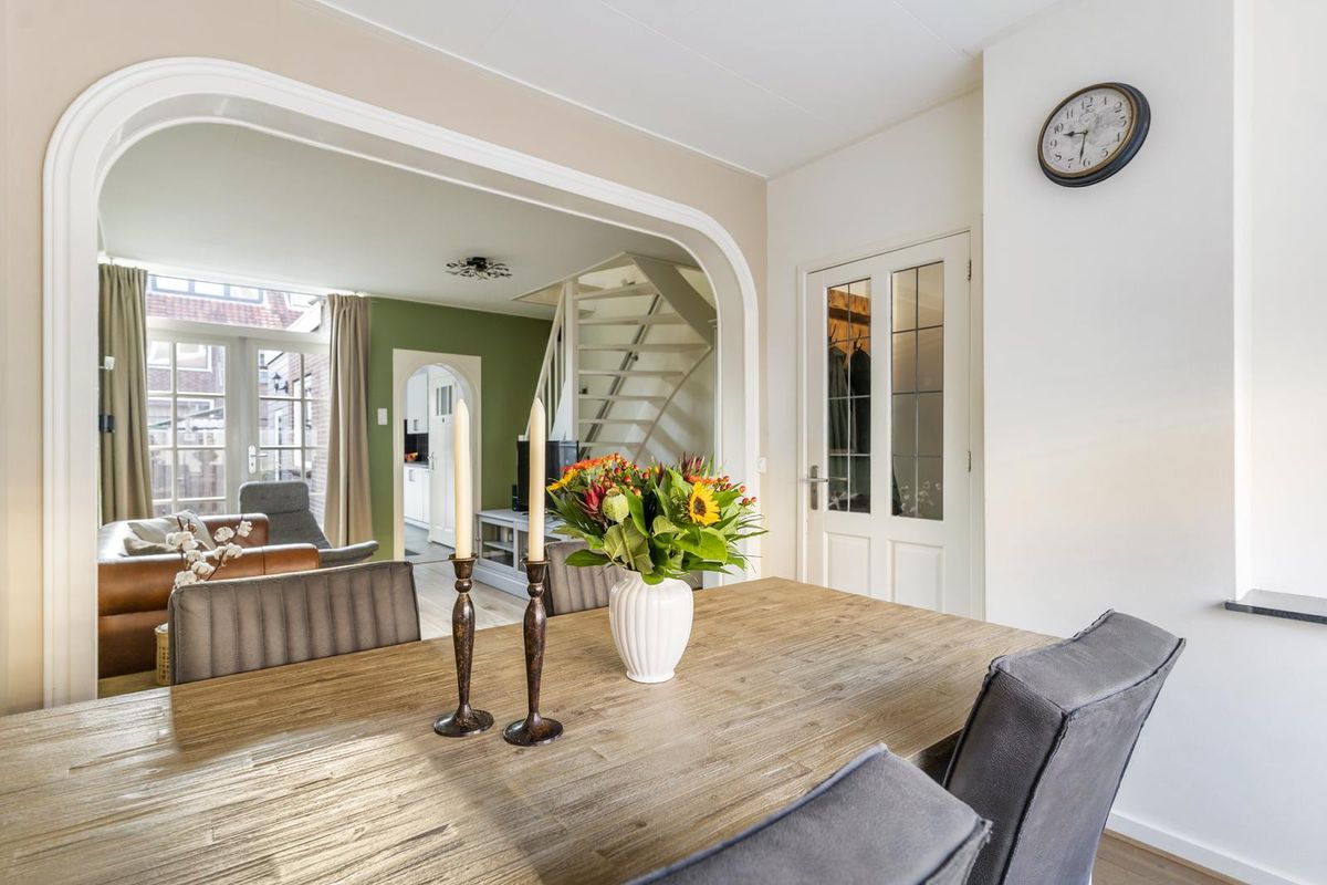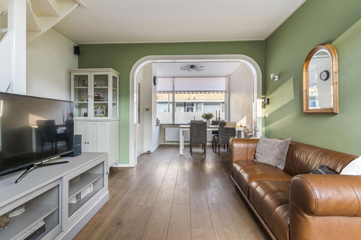 De woning straalt warmte en sfeer uit zodra je binnenstapt. In de hal valt de prachtige houten vloer meteen op, die naadloos doorloopt in de woonkamer. De wanden zijn strak gestuukt, wat het geheel een moderne en verzorgde uitstraling geeft.