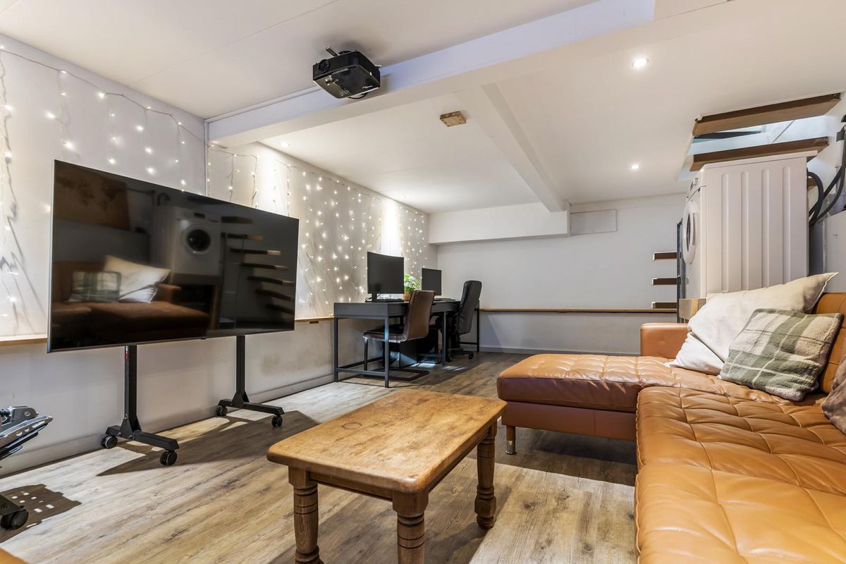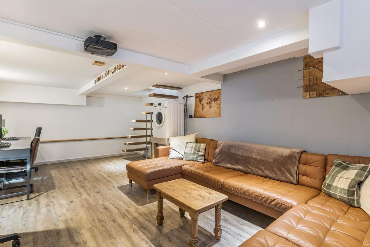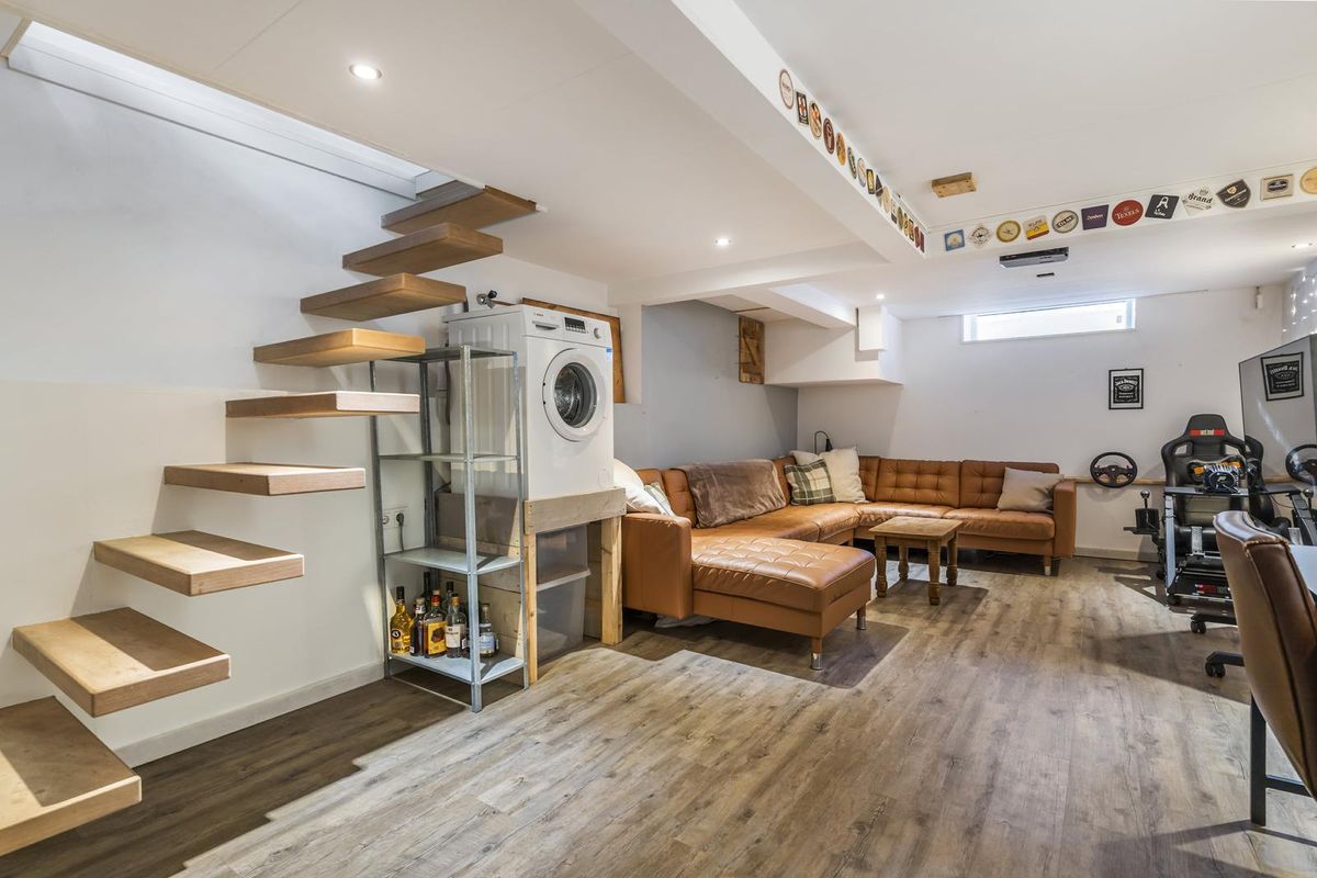 Via een stijlvolle, zwevende trap bereik je de kelderverdieping. Deze royale ruimte is hoog genoeg om volop te gebruiken en is met zorg afgewerkt. Dankzij de koele temperatuur blijft het er ook in de zomer comfortabel. Momenteel doet het souterrain dienst als home-office, game- en tv-kamer – een ideale extra leefruimte voor het hele gezin.