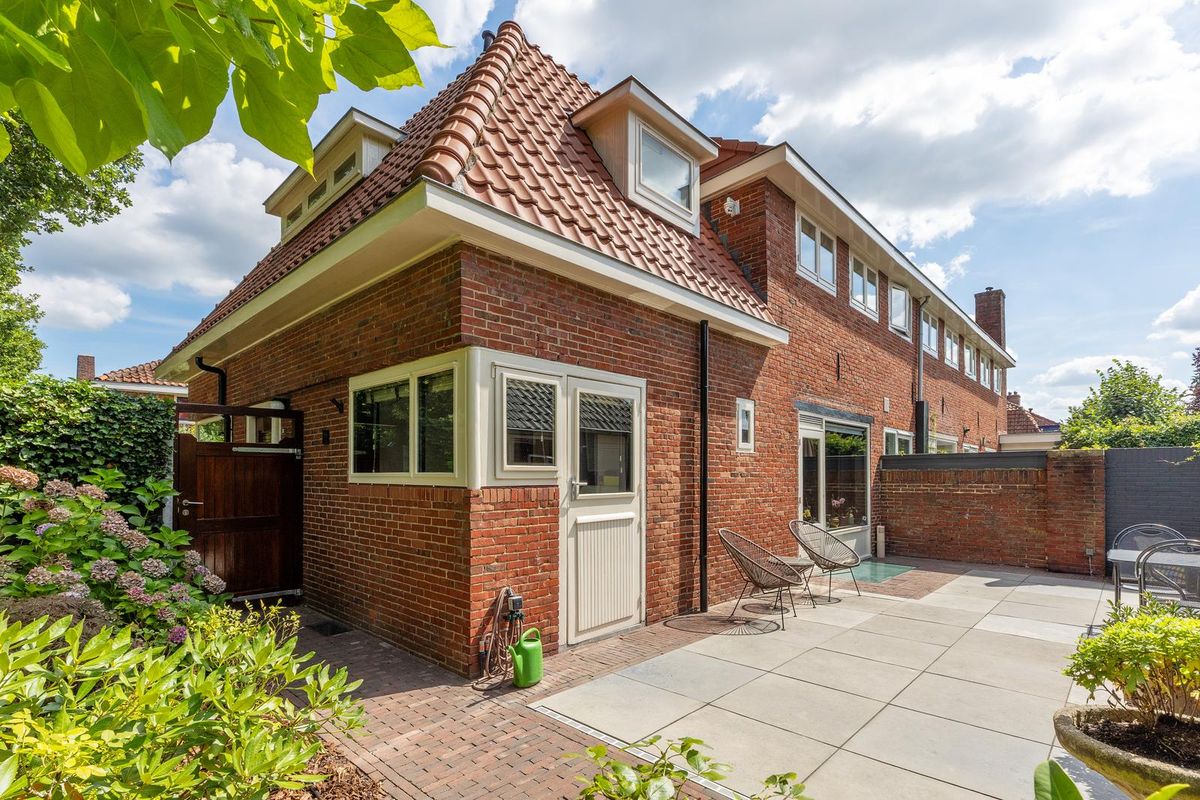 Dankzij de verhoogde ligging en de royale raampartijen baadt de woonkamer in het licht en staat deze in direct contact met de lommerrijke tuin en omgeving. Authentieke details zoals paneeldeuren, ronde architraven, gekrulde uitzetijzers, schakelmateriaal en de karakteristieke erker geven dit woonhuis zijn onmiskenbare charme. Het betreft bovendien het grootste type woning binnen deze monumentale wijk, ontworpen door de architecten P. Vorkink en J.P. Wormser. De Amsterdamse Schoolstijl, verrijkt met invloeden van de Engelse landelijke bouwstijl, geeft de woning haar unieke allure en tijdloze uitstraling.