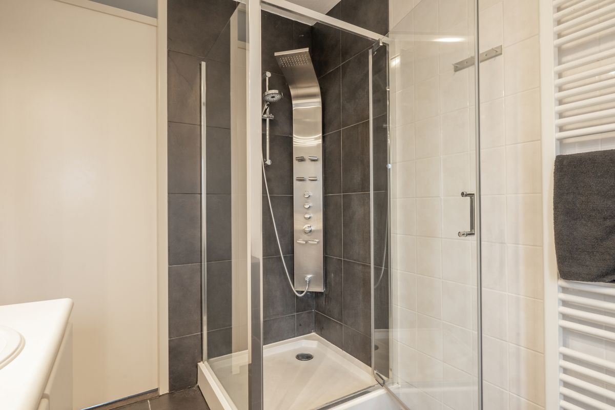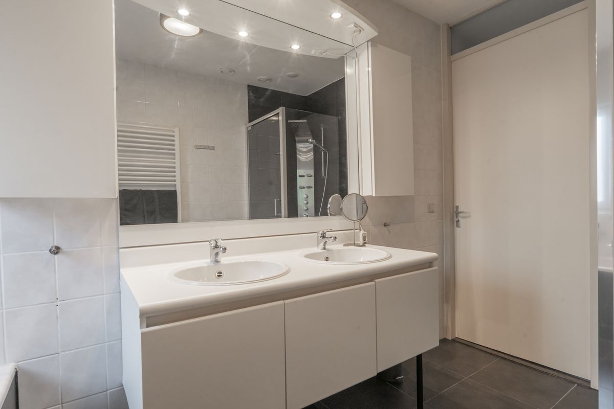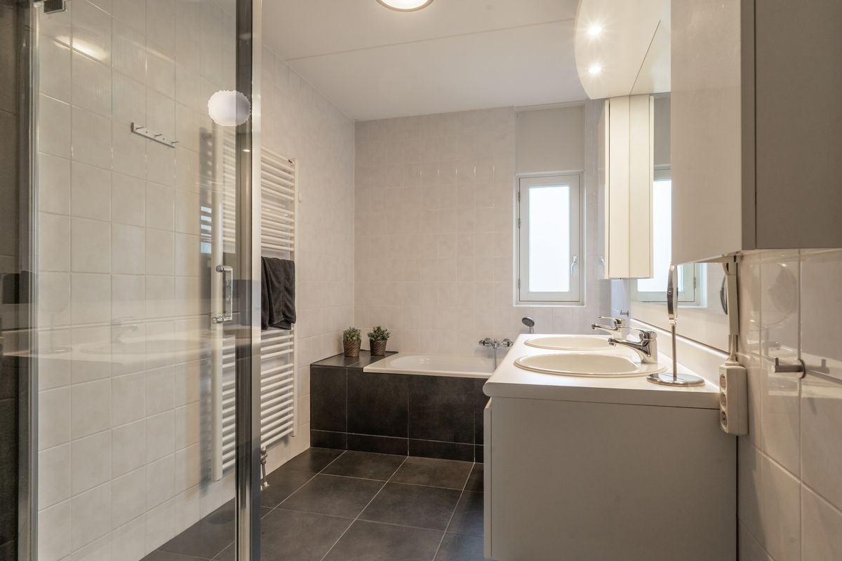 1e verdieping: overloop met separaat toilet met fonteintje, 2 ruime slaapkamers beide voorzien van rolluiken (resp. groot 14 m² en 10 m²), moderne badkamer voorzien van ligbad, douchecabine en wastafelmeubel.