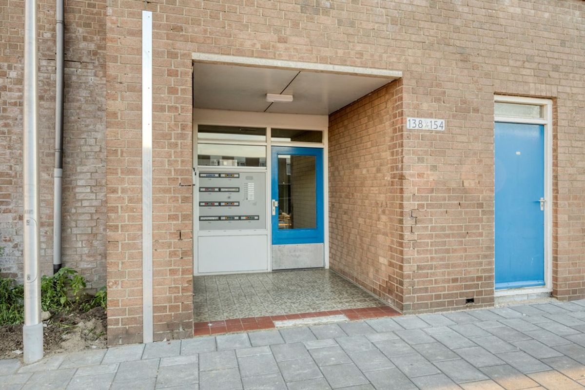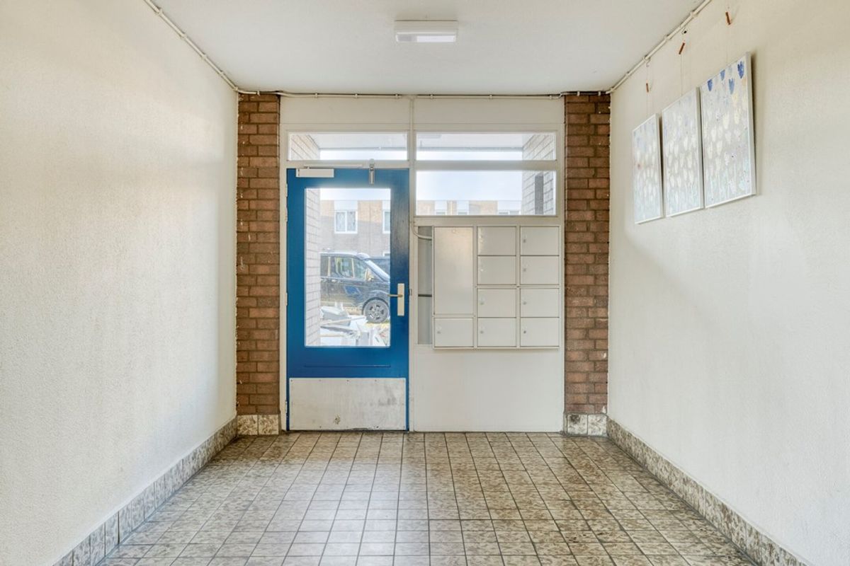 Afgesloten portiek met bellentableau, brievenbussen en trappenhuis.