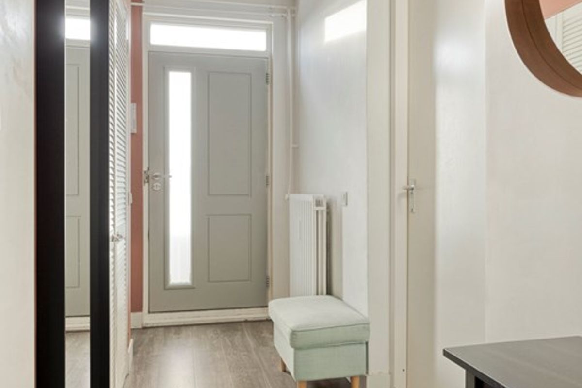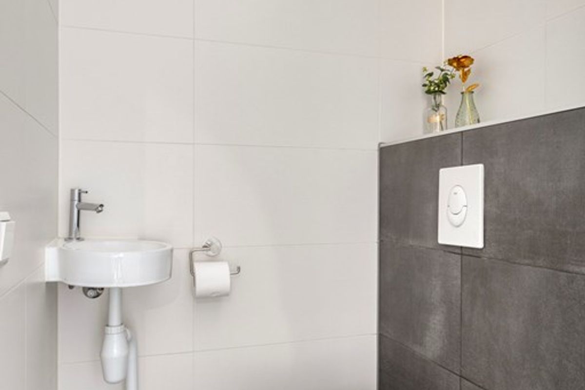 De entree van het appartement bestaat uit een hal met garderoberuimte en een praktische inpandige berging met wasmachine- en drogeraansluiting. De hal loopt over in de woonkamer. Er bevindt zich een losse, afgesloten meterkast en een nette toiletruimte met wandcloset en fonteintje.
