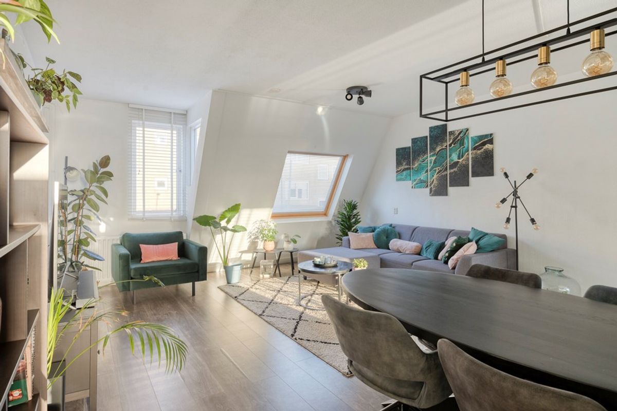 De ruime en lichte woonkamer heeft een mooie laminaatvloer en grote raampartijen. Door de fijne lichtinval voelt de ruimte uitnodigend en huiselijk aan.