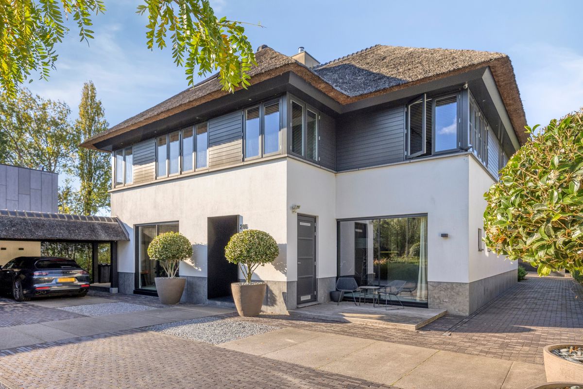 De gehele woning wordt omringd door een fraai aangelegde tuin, ontworpen door de tuinarchitect Teo van Horssen Hoveniers, volledig uitgerust met een irrigatiesysteem voor optimaal onderhoudsgemak en een perfecte integratie van het groen rondom het huis. De voortuin beschikt over een beveiligd en automatisch hek en biedt een stijlvolle carport, uitgevoerd in dezelfde stijl als de woning, met plaats voor drie auto’s, terwijl de betegelde oprijlaan extra parkeergelegenheid creëert.