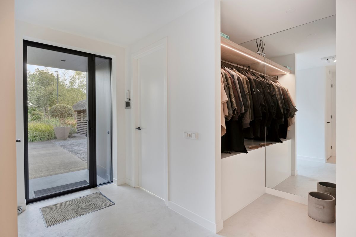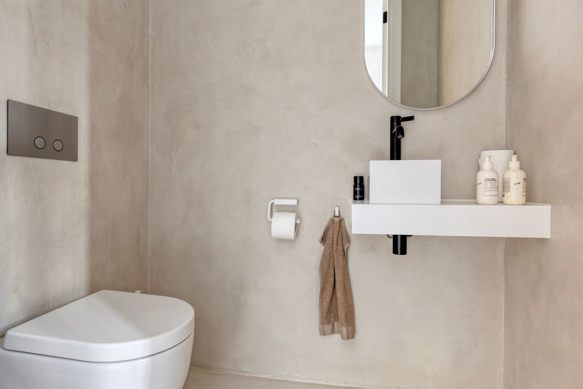 Bij binnenkomst in de ruime hal valt direct de prachtige beton cirévloer op, die door het gehele huis en op alle verdiepingen is doorgevoerd. Deze stijlvolle en tijdloze afwerking heeft een licht karakter, dat door subtiele oneffenheden een levendig en uniek uiterlijk met mediterrane allure krijgt. In de hal komt dit prachtig samen met het interieur. Het iconische Ligne Roset-krukje vormt een smaakvolle combinatie met een hangend doek, dat als kunstzinnig achtergrond is toegepast.