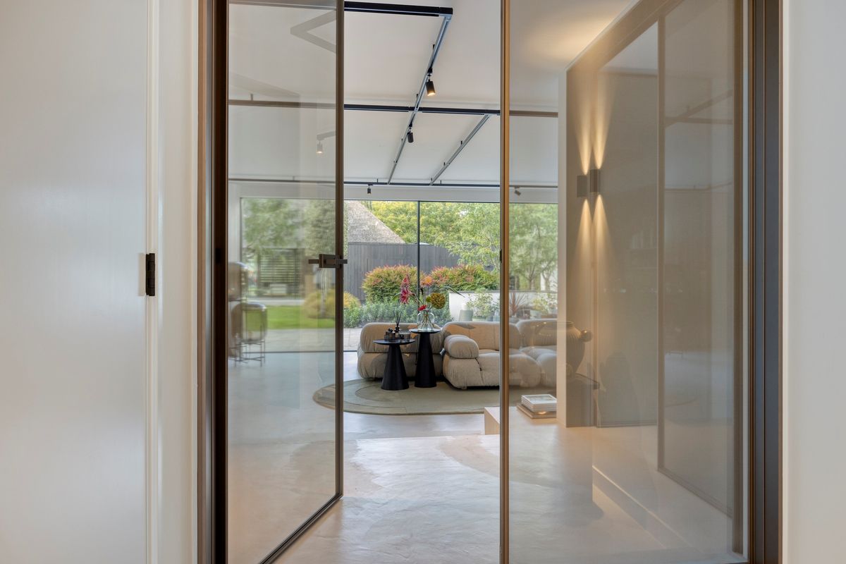 Vanuit de hal heb je toegang tot het stijlvolle kantoor met stoel en krukjes van Carl Hansen & son en een ovale werktafel van Arco en FLOS hanglampen. De grote schuifpui biedt uitzicht op de voortuin, met veel natuurlijk licht.