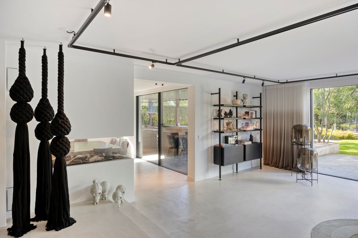 Tussen de hal en de woonkamer is een subtiele verhoging met een trede aangebracht, waardoor de royale oppervlakte een speels en levendig karakter heeft. Centraal in de woonkamer staat de indrukwekkende modulaire bank van B&B Italia, de Camaleonda, die als ware ‘eyecatcher’ direct de aandacht trekt. Ontworpen door Mario Bellini in 1970, straalt deze iconische designbank tijdloze elegantie uit en vormt een prachtig contrast met de stijlvolle beton cirévloer. Dankzij de modulaire opstelling van de bank kun je aan de ene kant genieten van een avond voor de televisie, terwijl je aan de andere kant heerlijk zit met een goed boek. De schuifpuien over de gehele breedte bieden een prachtig uitzicht over de tuin. De organische karpetten verzachten het karakter van de bank.