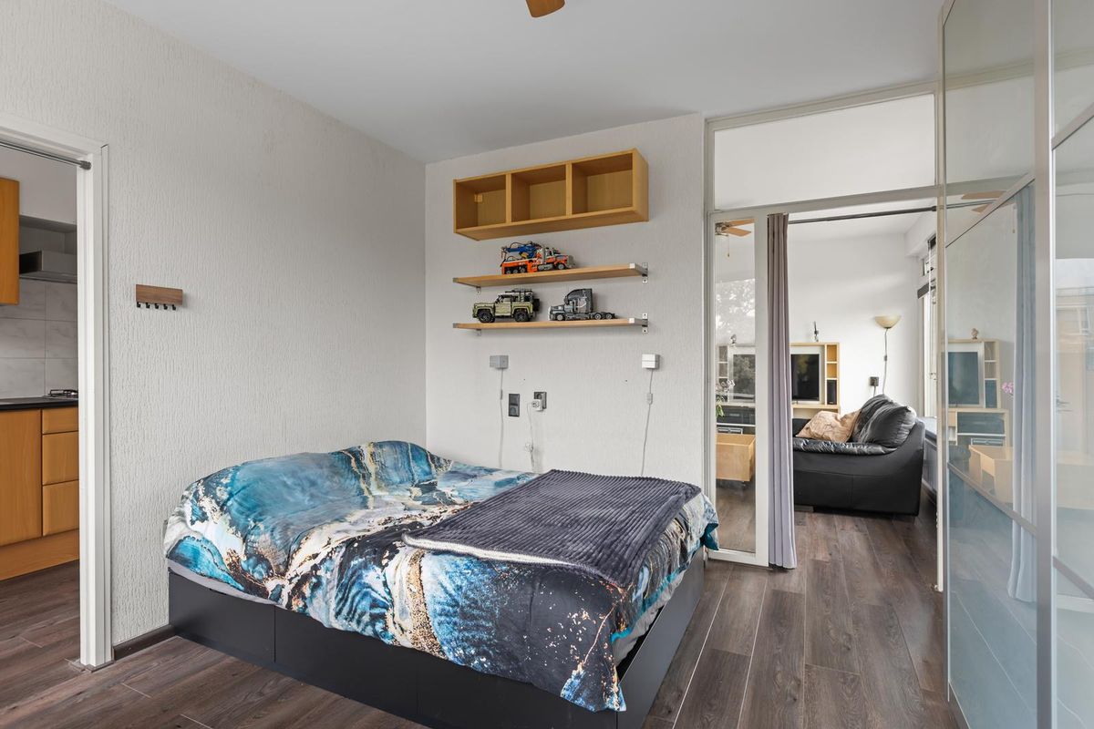 Op de hoek van het appartement, tussen de keuken en de woonkamer vind je de slaapkamer met genoeg ruimte voor een tweepersoonsbed en grote kledingkast. Werk je thuis? Naast jouw slaapkamermeubels biedt de kamer de mogelijkheid voor een fijne werkplek. De badkamer is compact, maar van alle gemakken voorzien om te verfrissen. Denk daarbij aan een inloopdouche, wastafel en toilet.