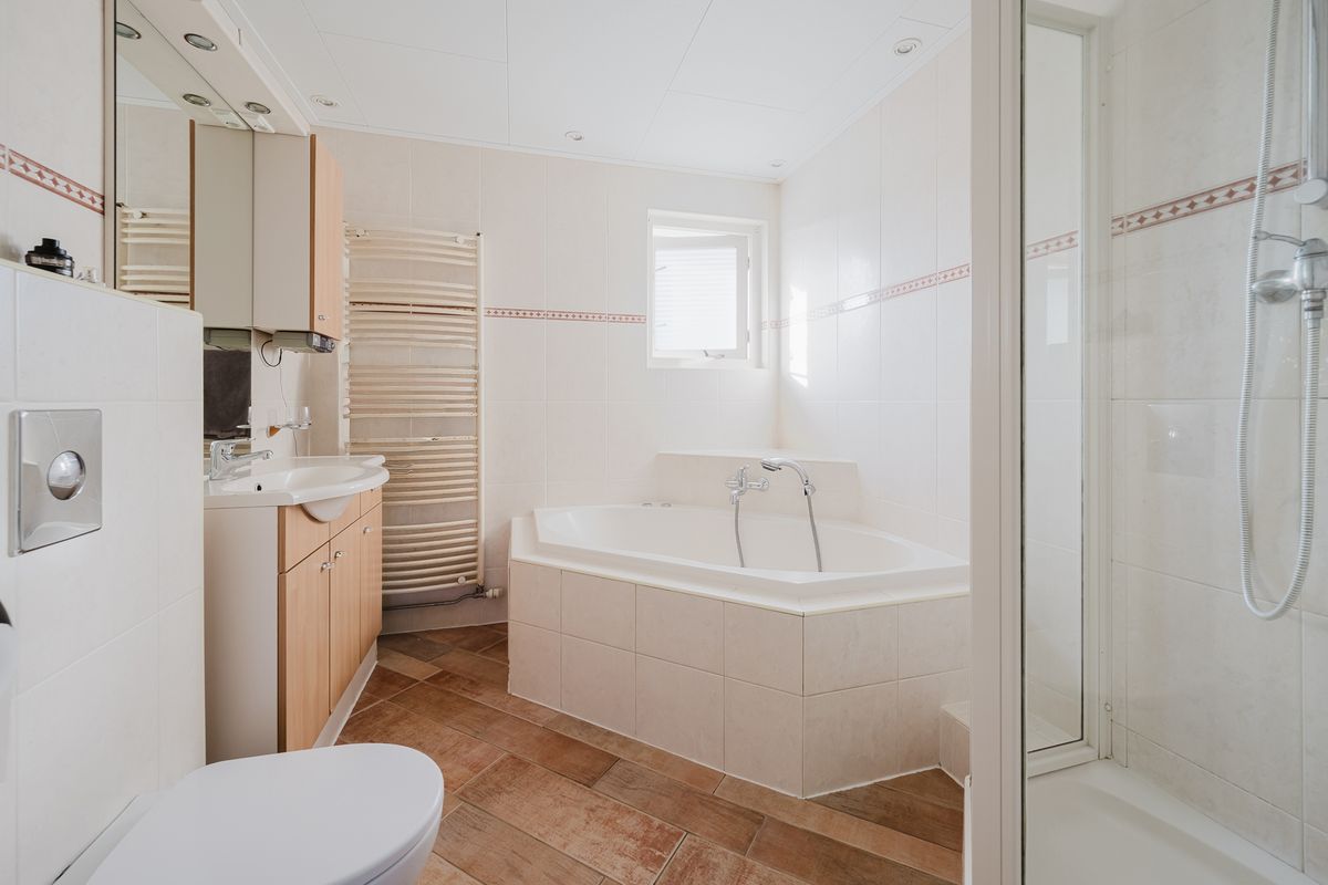 De ruime badkamer is volledig betegeld en is voorzien van een royaal hoekbad, een douche, heeft een hangend toilet en een wastafel met wastafelmeubel.