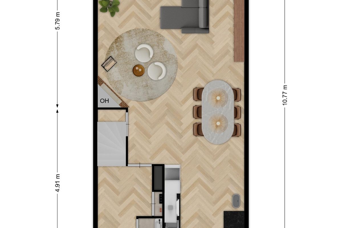 Eenmaal terug in de woonkamer bereik je aan de voorzijde de ruime open keuken.