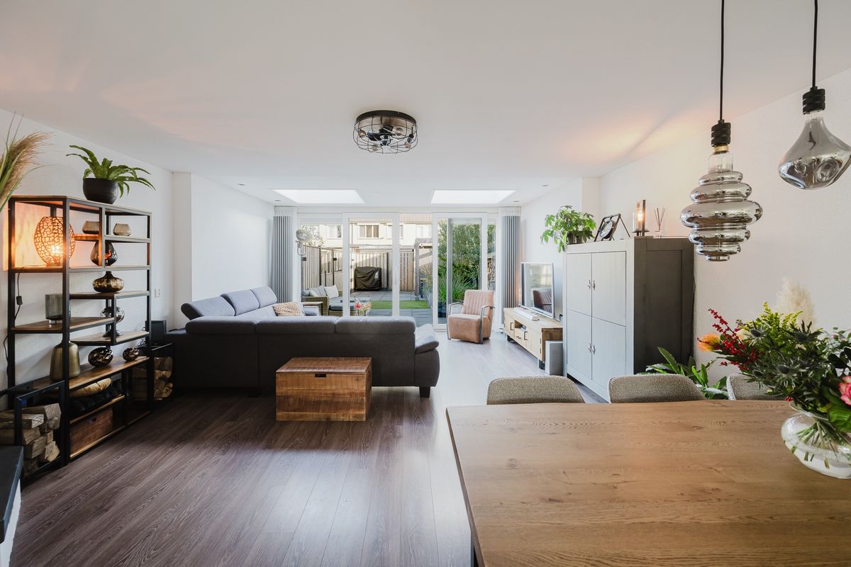 Bij binnenkomst valt direct de zeer ruime woonkamer op. Dankzij de uitbouw met lichtkoepels geniet je hier de hele dag van een prachtige natuurlijke lichtinval, wat zorgt voor een prettige en open sfeer.