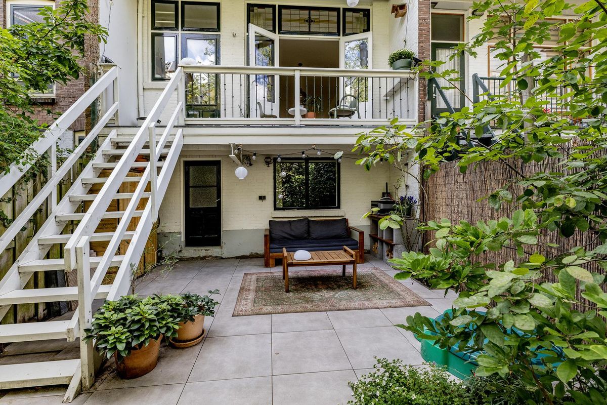 De beschutte, groene tuin ligt op het noordoosten. De grote boom zorgt voor de nodige privacy en geeft de erfgrens aan van diverse panden. Een kleine oase in een stadse wijk.
