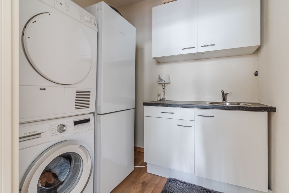Daarnaast is er nog een praktische bijkeuken, waar ook de aansluiting voor de wasmachine te vinden is.