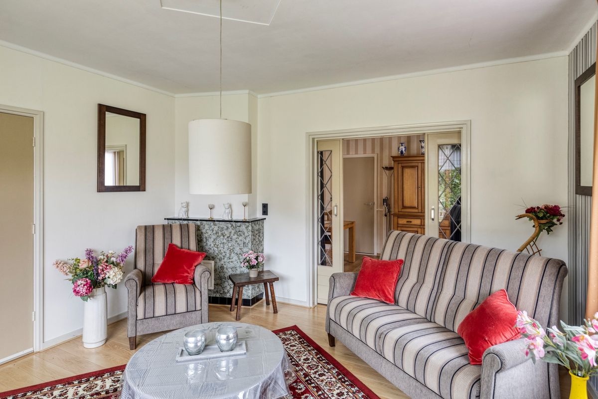 Woonkamer-en-suite met voorkamer voorzien van schouw en van hieruit prachtig vrij uitzicht. Ruime woon-/eetkamer met vaste kast, rookkanaal met houtkachel en tuindeur naar terras.