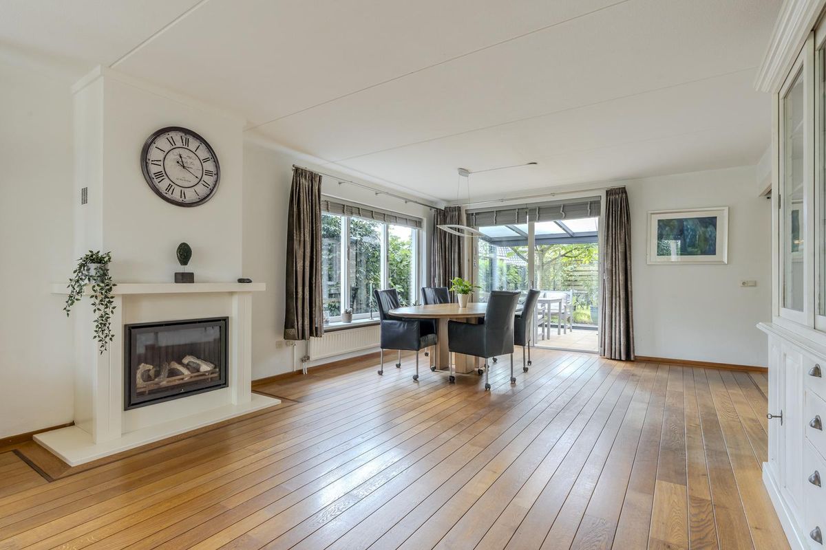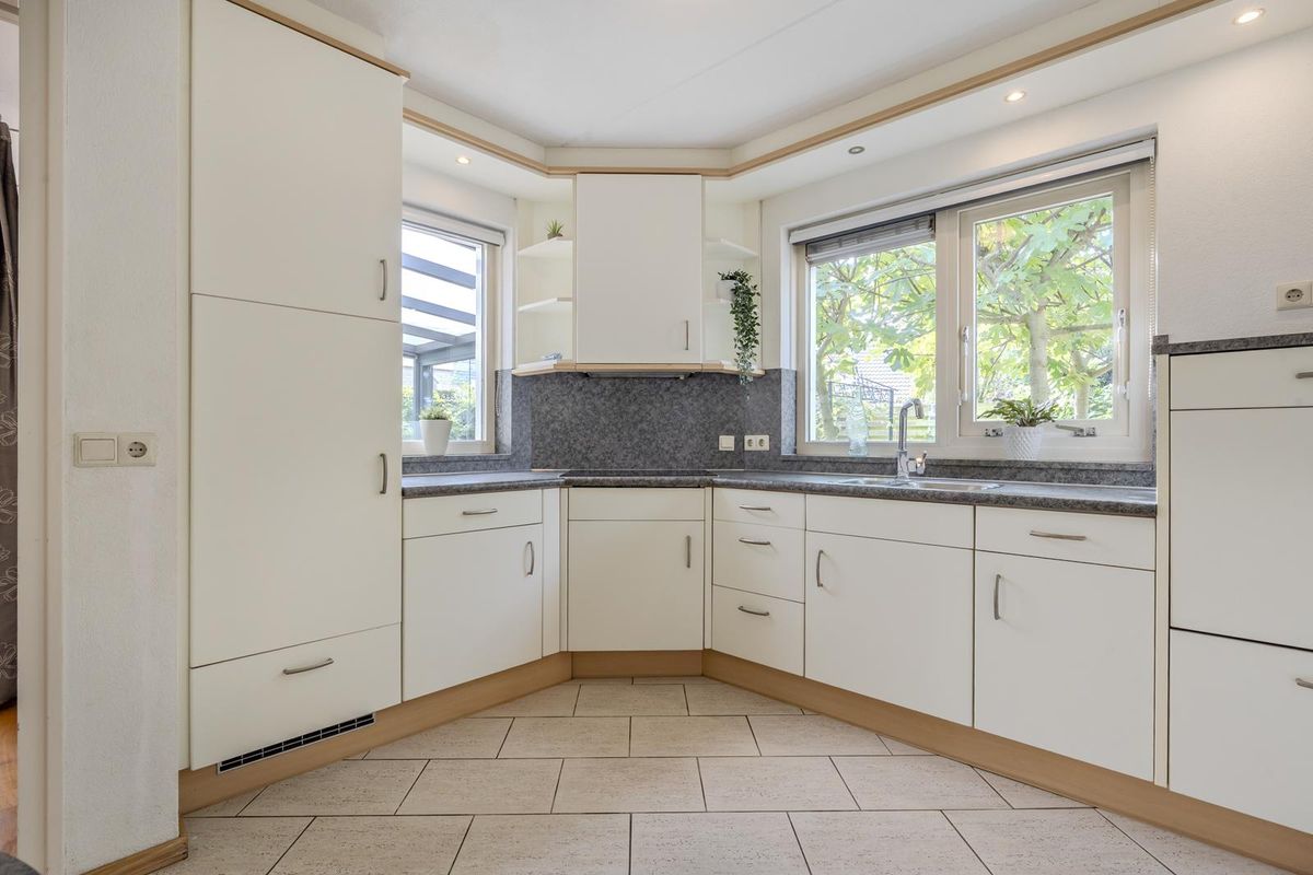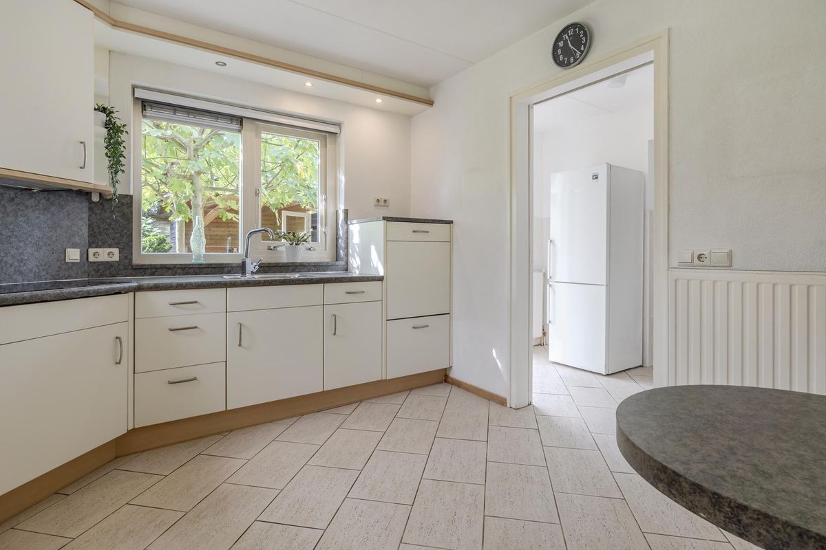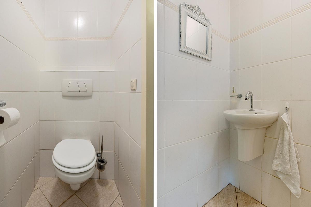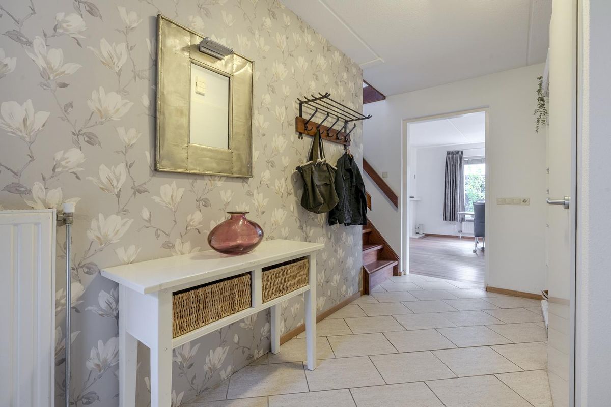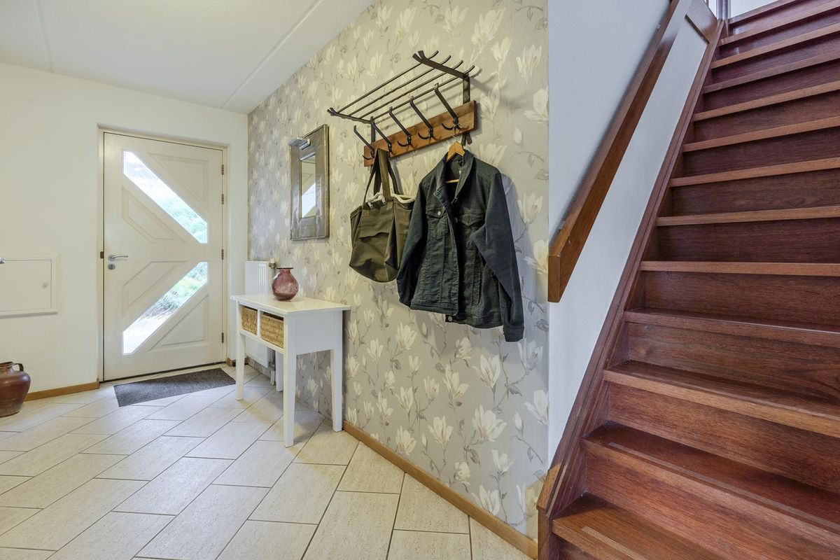 De ruime entreehal, afgewerkt met een plavuizenvloer, geeft toegang tot de meterkast, het separate toilet en de sfeervolle woonkamer. Deze is voorzien van een houten vloer en een gezellige gashaard. Via de schuifpui is er een directe verbinding met de lichte tuinkamer, waar elektrische zonwering aan de binnenzijde extra comfort biedt op warme dagen. Samen vormen de tuinkamer en de groene tuin een heerlijk verlengstuk van de woonkamer. De gesloten keuken is voorzien van een plavuizenvloer en biedt veel berg- en werkruimte. Indien gewenst kan de muur naar de bijkeuken worden verwijderd, waardoor de keuken een nog ruimere uitstraling krijgt. De bijkeuken heeft eveneens een plavuizenvloer en is uitgerust met aansluitingen voor wasmachine en droger. Vanuit de bijkeuken is de garage bereikbaar, die is voorzien van een elektrische roldeur. Op de begane grond vindt u een comfortabele slaapkamer en een badkamer met een inloopbad met douche, dubbele wastafel en toilet – perfect voor gelijkvloers wonen of logees.