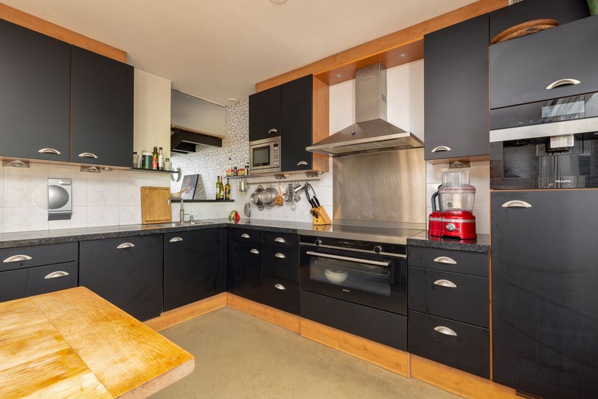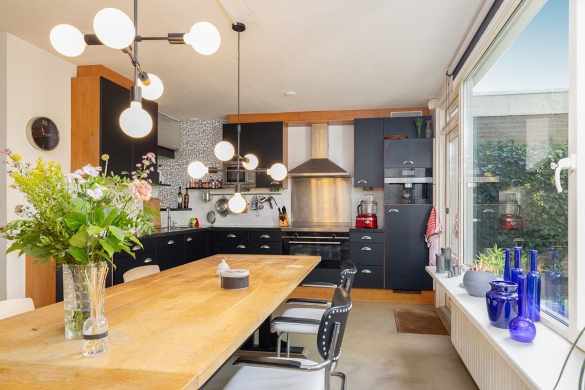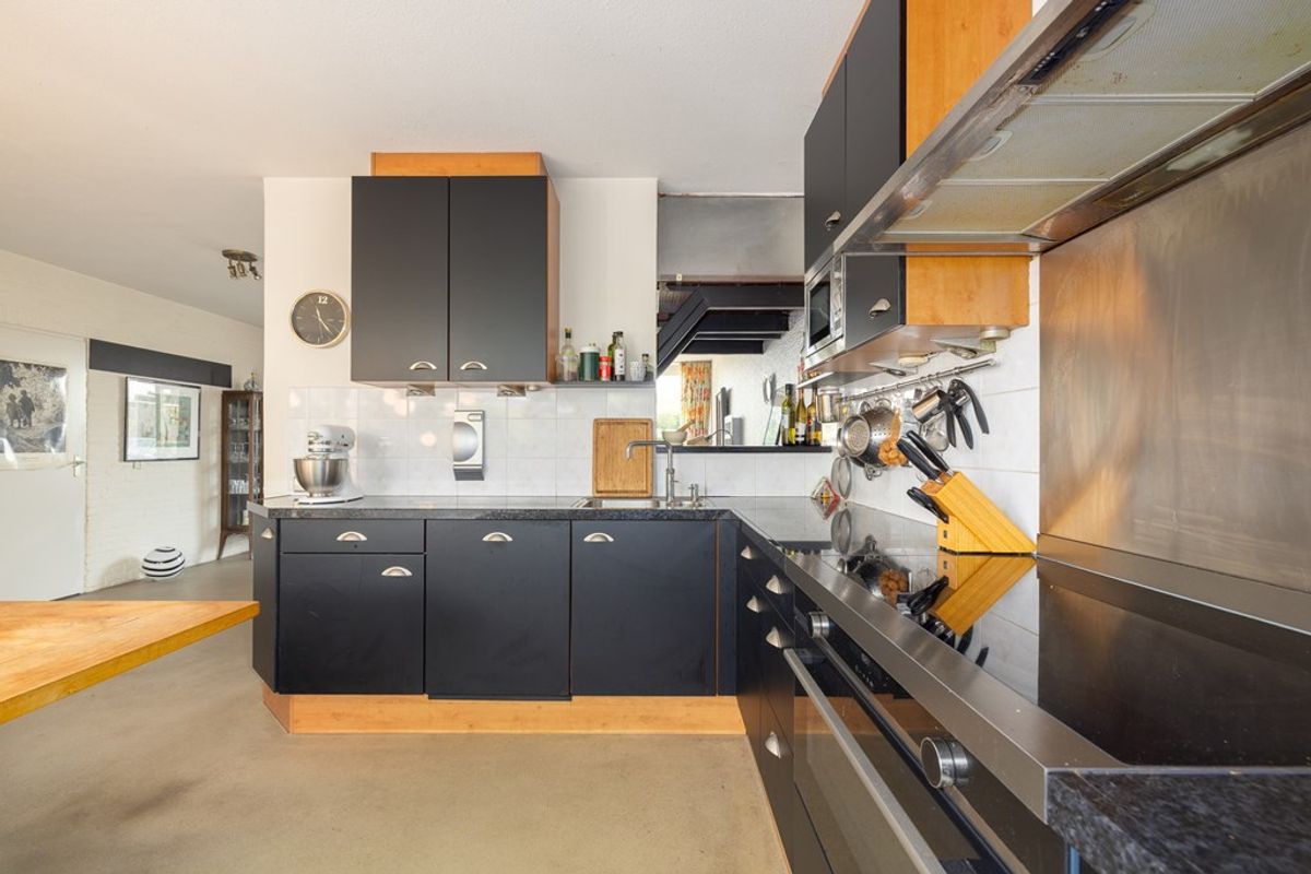 Een subtiele wand scheidt de woonkamer van de eetkeuken. Hier is plaats voor een grote eettafel en ook hier zorgen de vele ramen voor een prachtig uitzicht op de fraai aangelegde tuin. De luxe keuken is uitgevoerd in een moderne combinatie van zwarte fronten en warme houttinten, wat zorgt voor een sfeervolle en eigentijdse uitstraling.
