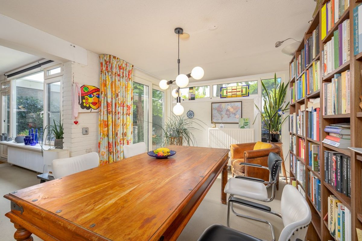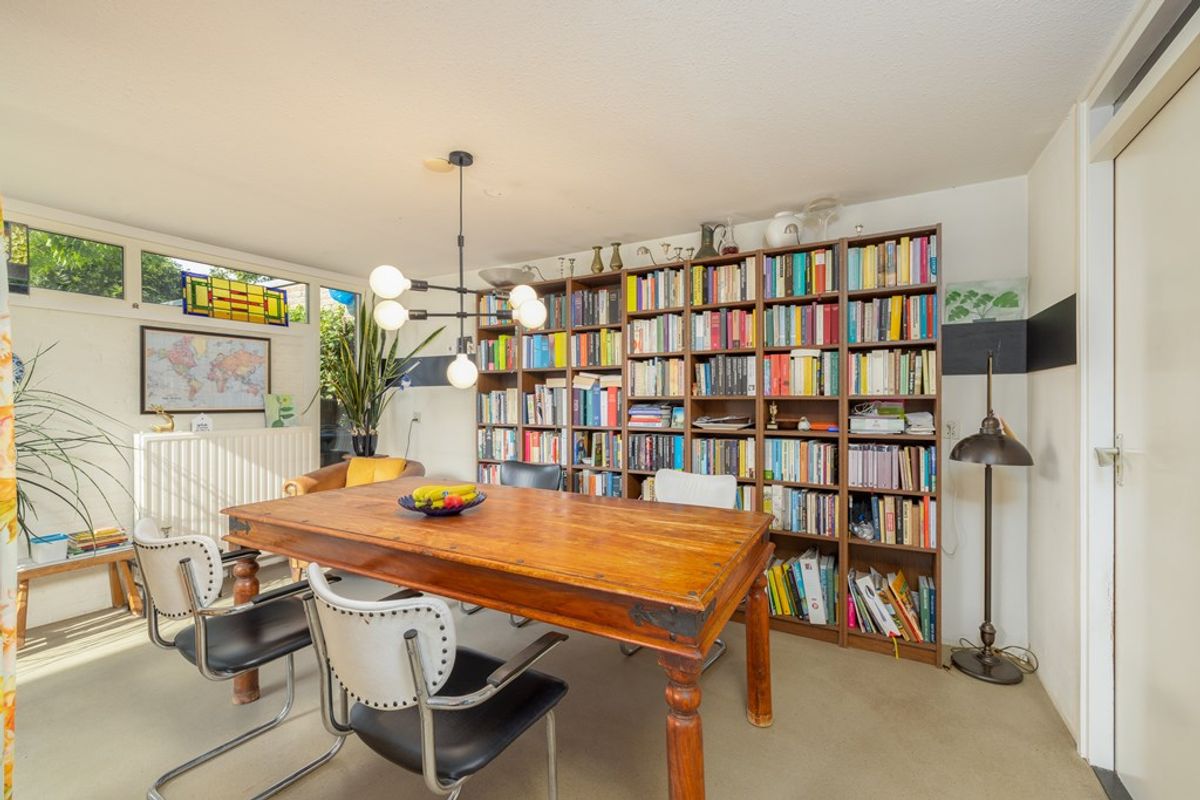 Via een brede toog bereikt u de studeerkamer, momenteel ingericht als bibliotheek. Met de schuifpui open vormt deze ruimte een mooi geheel met de tuin. Ideaal om rustig te werken, lezen of studeren, terwijl de rest van het gezin zich in de woonkamer vermaakt.