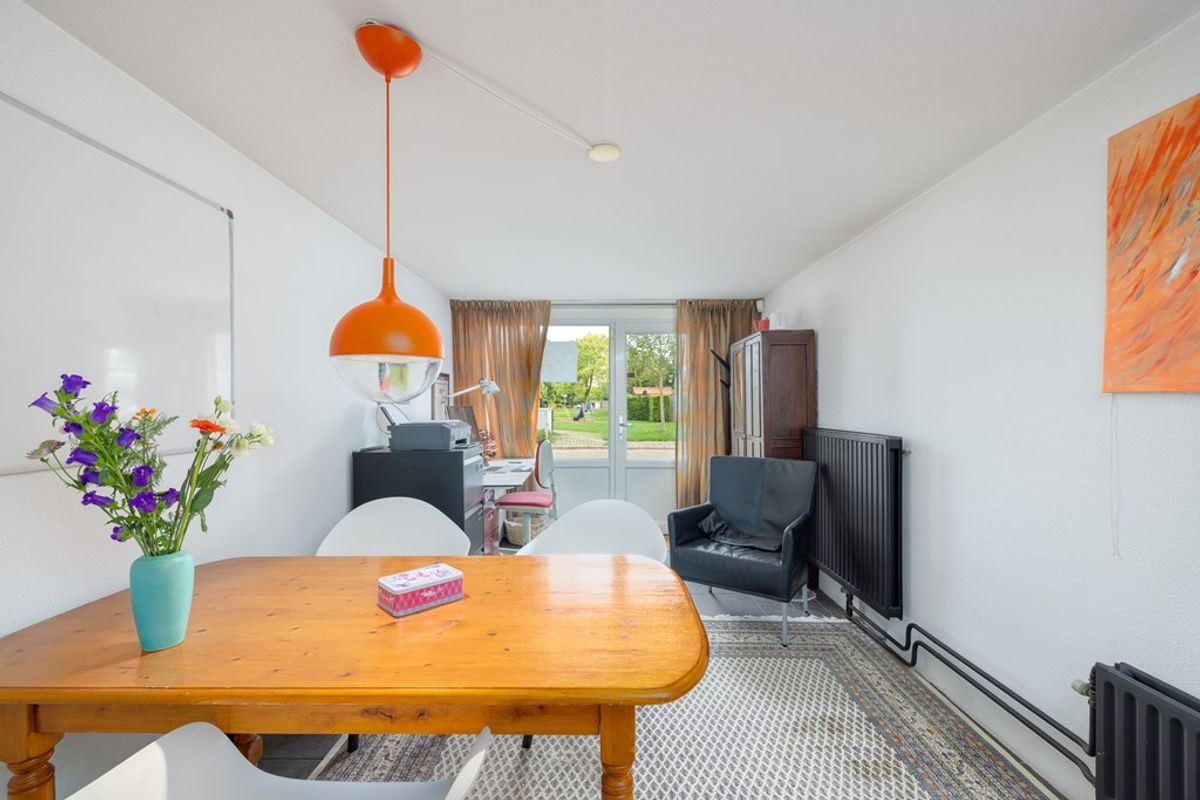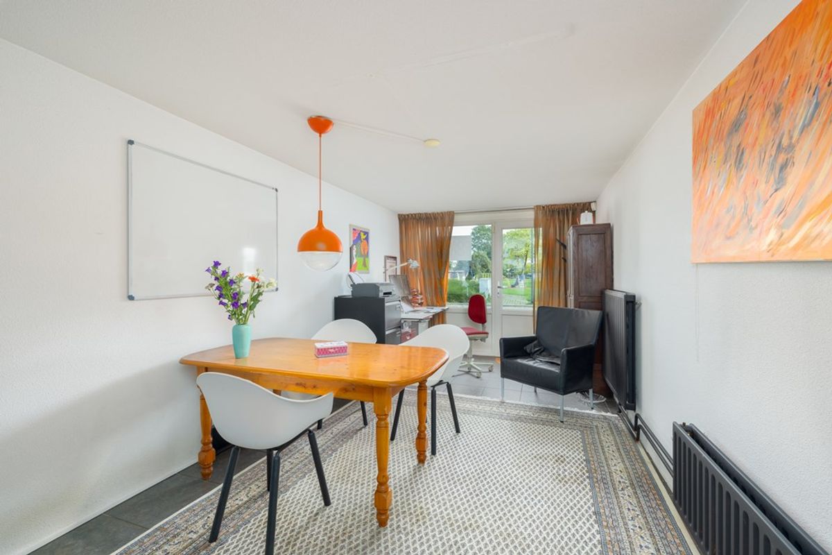 Verder beschikt de woning op de begane grond over een halletje met toilet en een voormalige garage, die is omgebouwd tot kantoorruimte. Achter deze ruimte bevindt zich nog een royale inpandige berging.