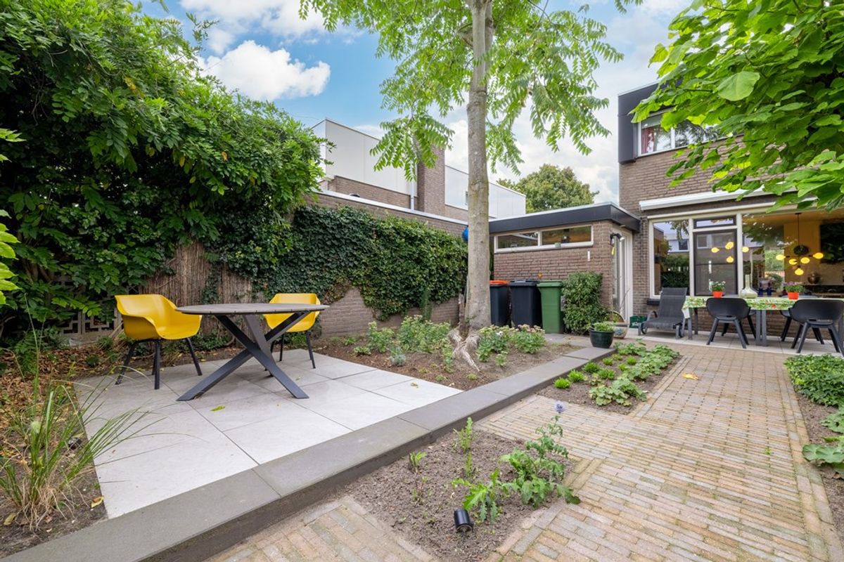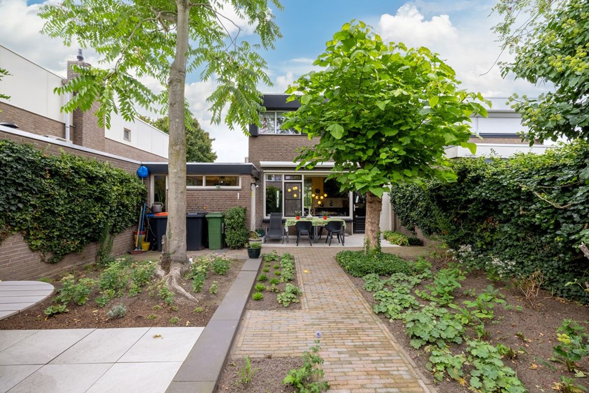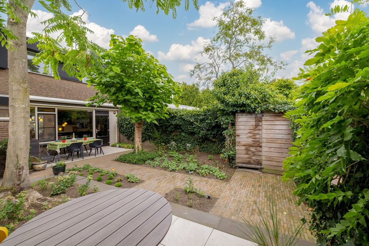 De diepe achtertuin op het zuidwesten is formeel aangelegd, maar door de volwassen beplanting en bomen waant u zich in mediterrane sferen – een vleugje Ibiza in eigen achtertuin. De tuin is bovendien goed bereikbaar via een brede brandgang.
