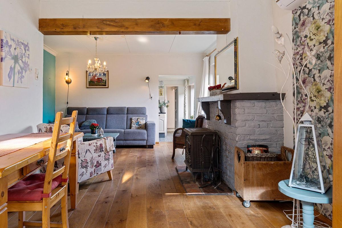 De voordeur met authentiek glas-in-lood leidt je naar de sfeervolle woonkamer. Hier zorgen de houten vloer, meerdere glas-in-loodramen, de open haard en de airco voor een fijne mix van comfort en karakter. De woonkamer biedt toegang tot zowel de gesloten keuken als de vaste trap naar de eerste verdieping.