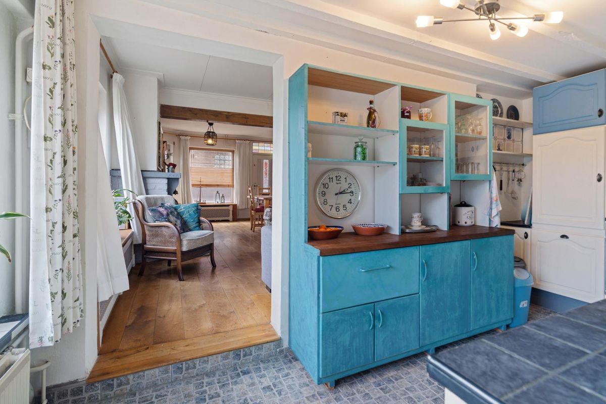 De keuken is praktisch ingericht met boven- en onderkasten, een oven, 4-pits gasfornuis, koelkast en spoelbak. Vanuit de keuken bereik je een tussenruimte die toegang geeft tot de tuin, een kast met cv-ketel en de aansluitingen voor was- en vriesapparatuur. Vanuit deze tussenruimte bereik je tevens het aparte toilet en de serre.