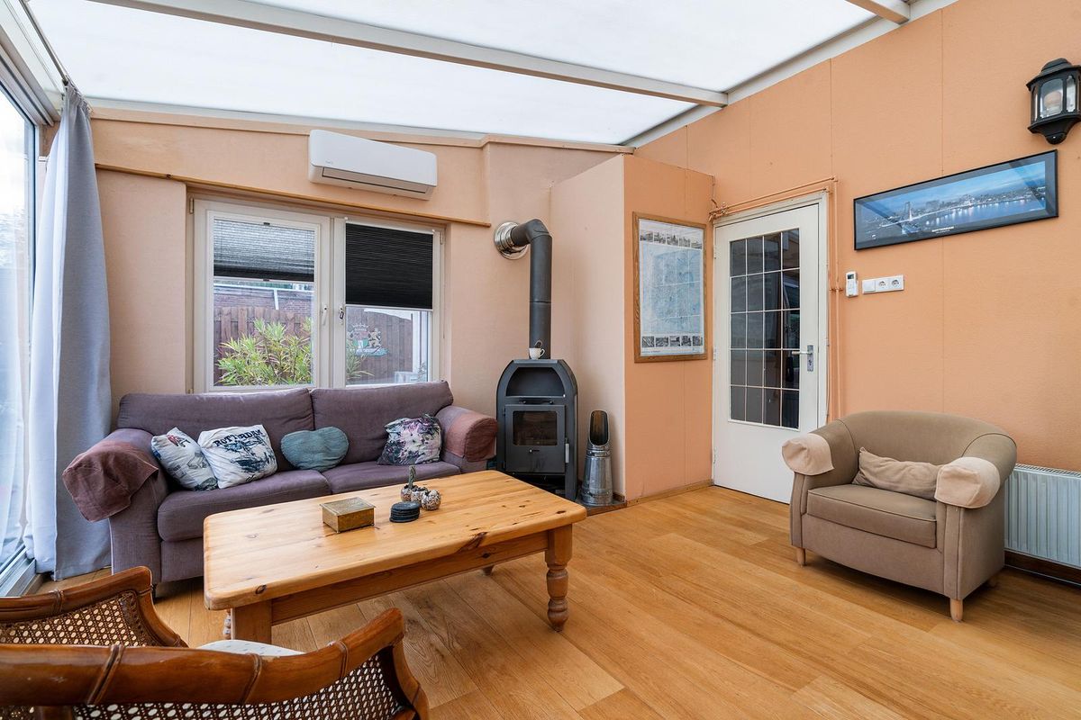 De serre is een heerlijke extra leefruimte met houten vloer, airco en houtkachel. Dankzij de schuifdeur en kiepdeur is de tuin eenvoudig bereikbaar, en via het luik in de vloer bereik je de kelder.