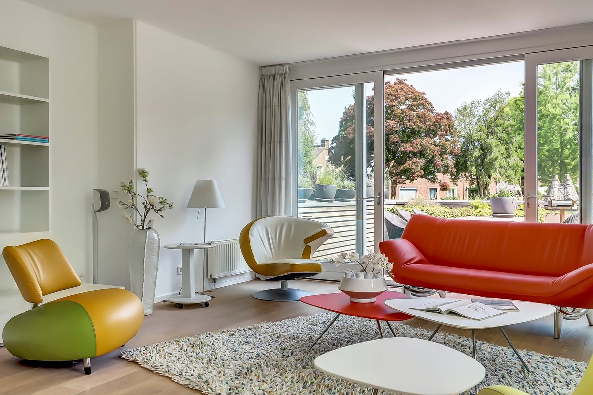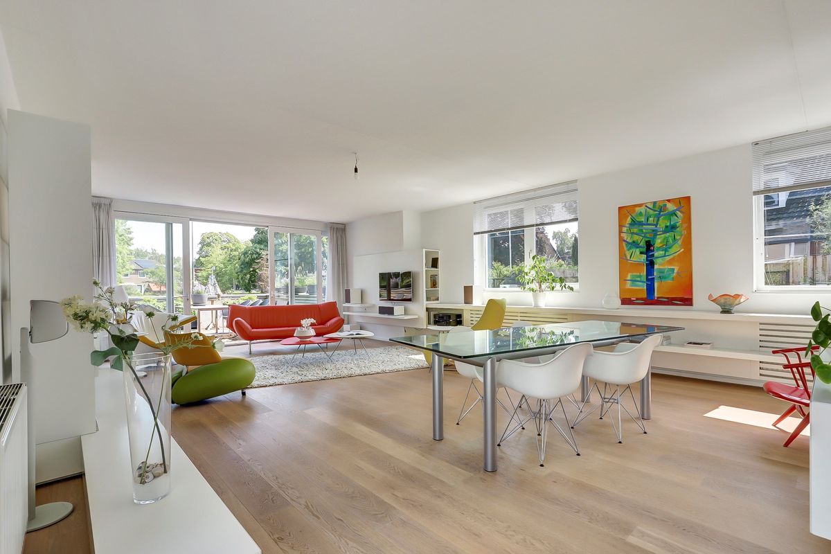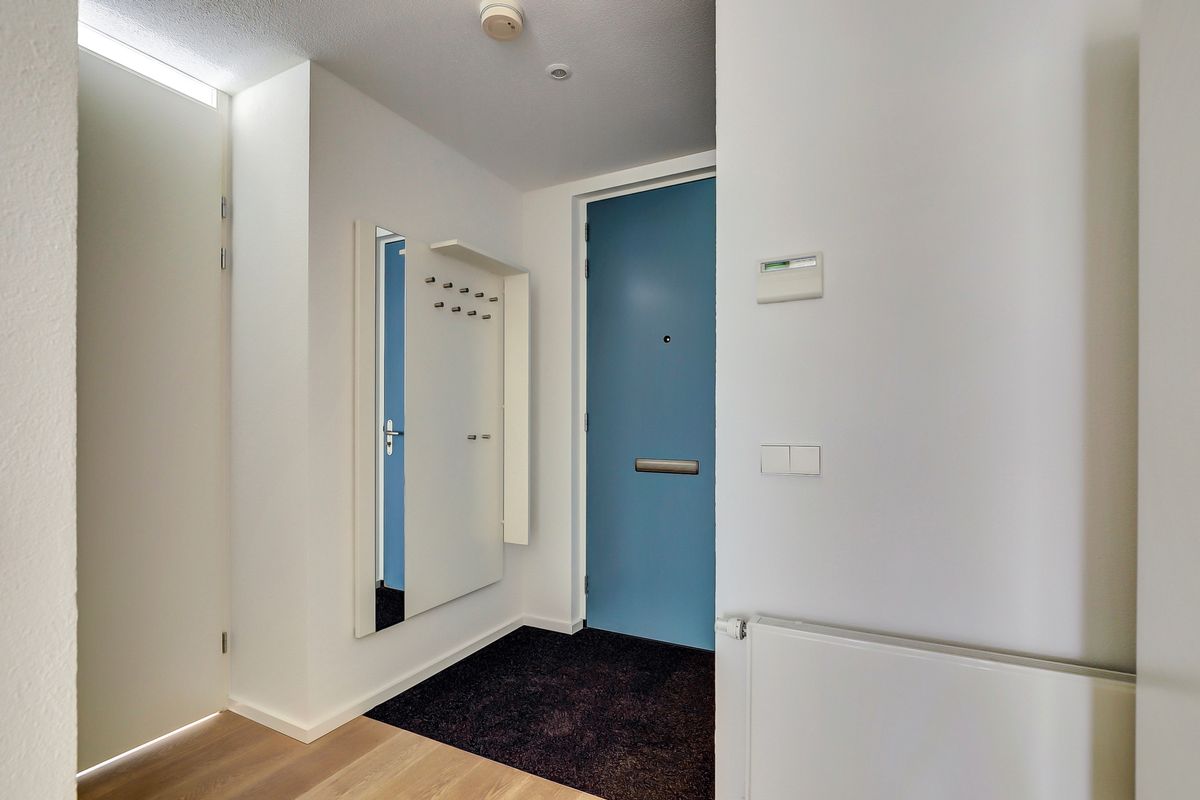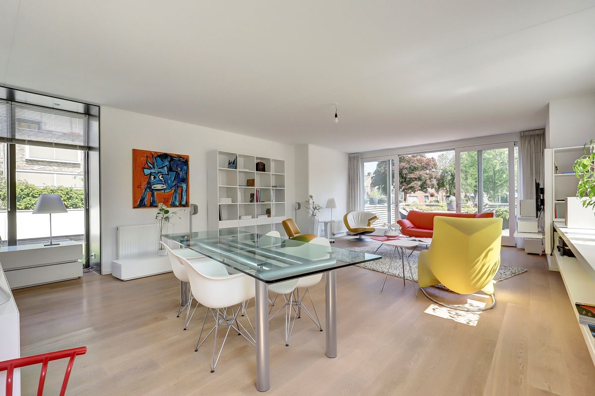 Aan drie kanten zijn er ramen waaronder een schuifpui naar het dakterras. Het licht stroomt in dit appartement royaal aan alle kanten naar binnen.