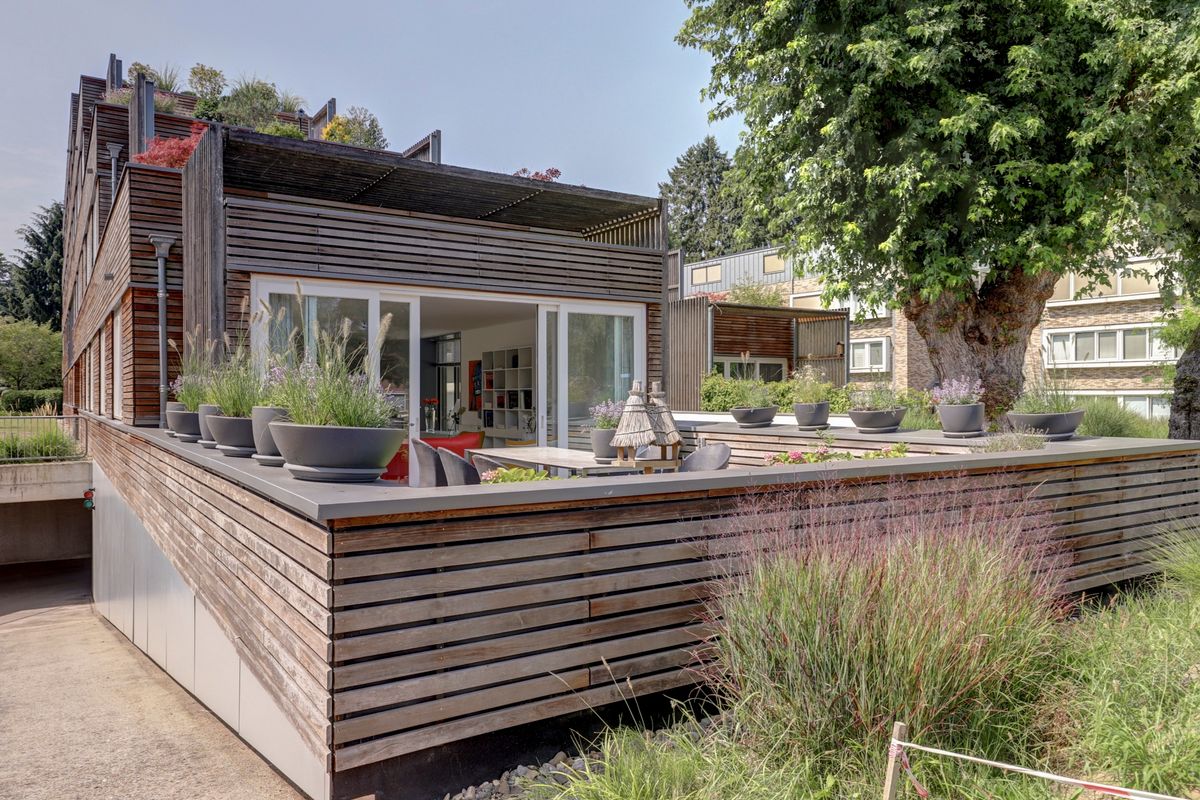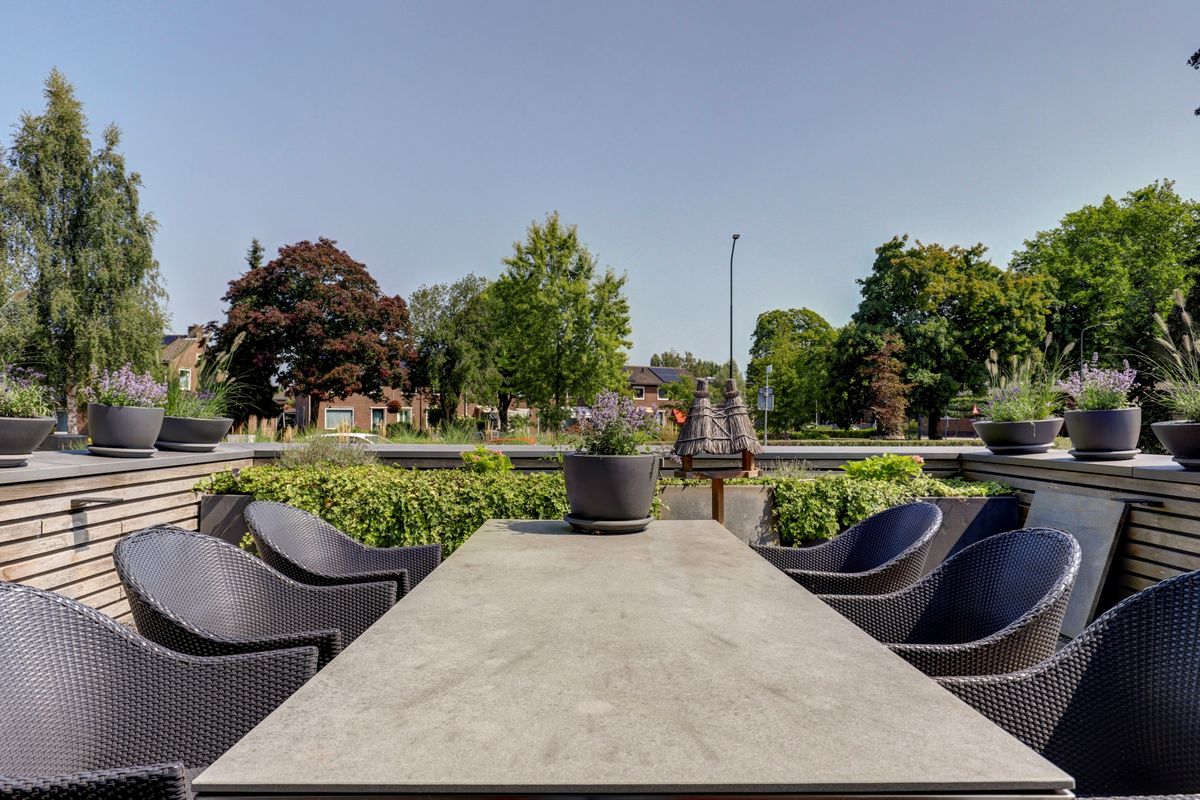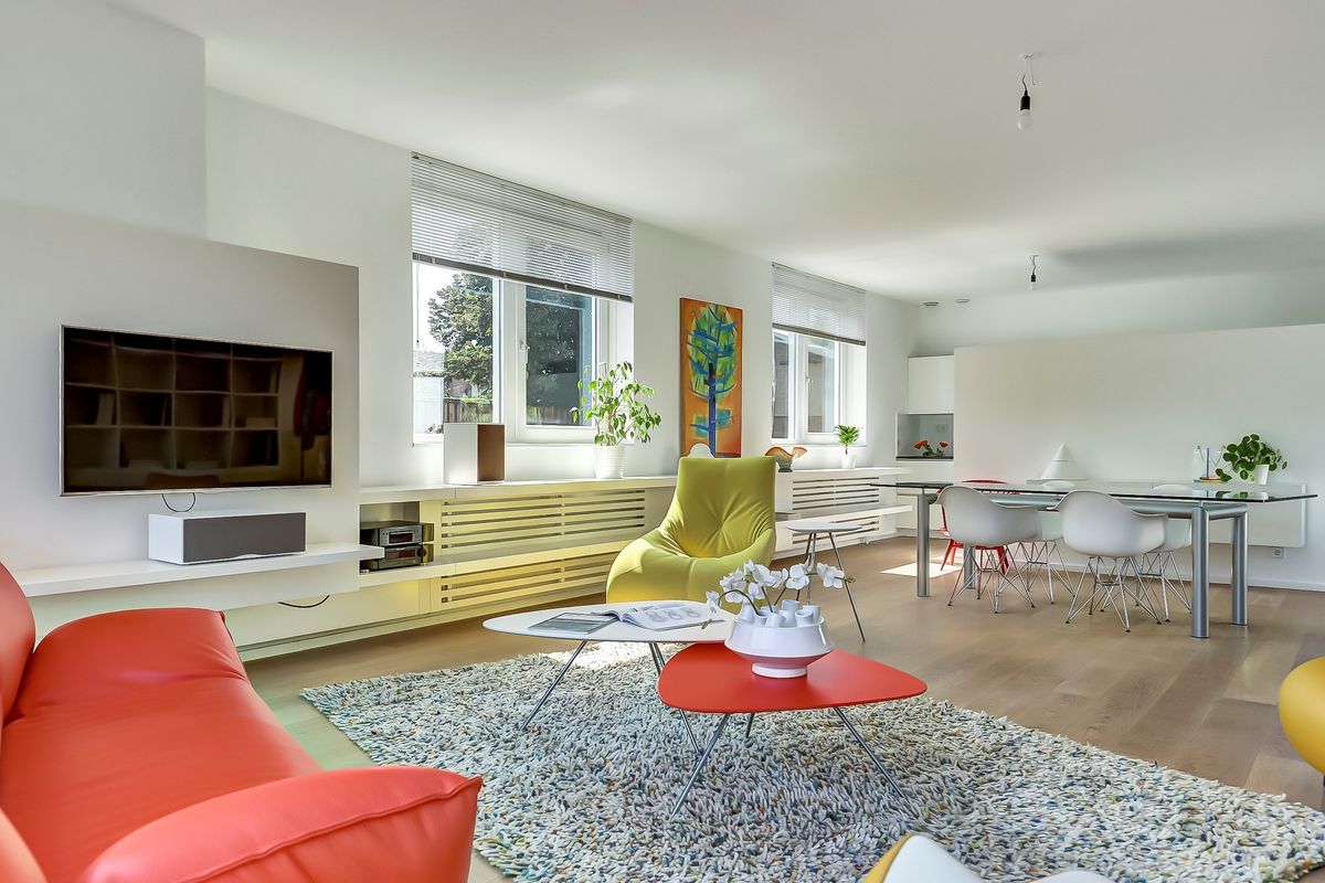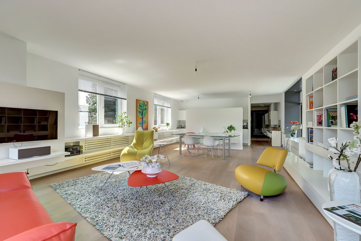 Aan drie kanten zijn er ramen waaronder een schuifpui naar het dakterras. Het licht stroomt in dit appartement royaal aan alle kanten naar binnen.