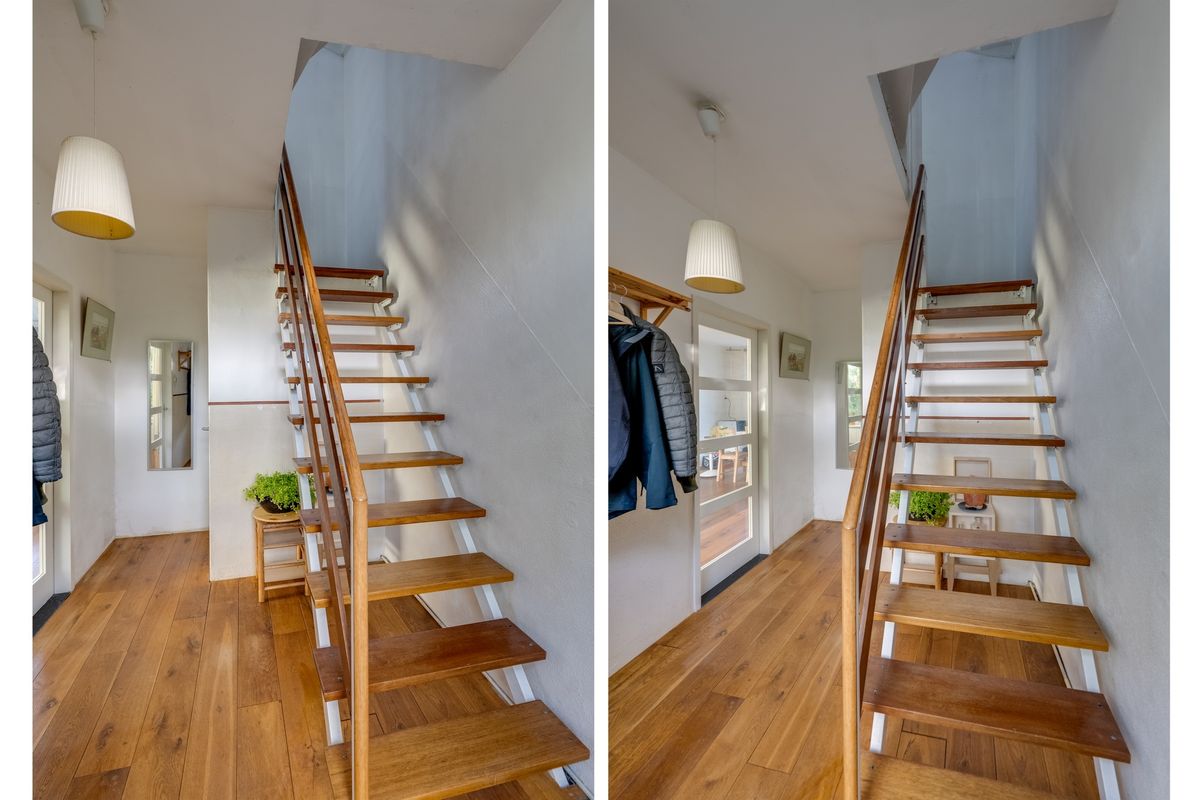 Vanuit de hal heeft u toegang tot 3 slaapkamers, de badkamer en de vaste trapopgang naar de tweede verdieping.