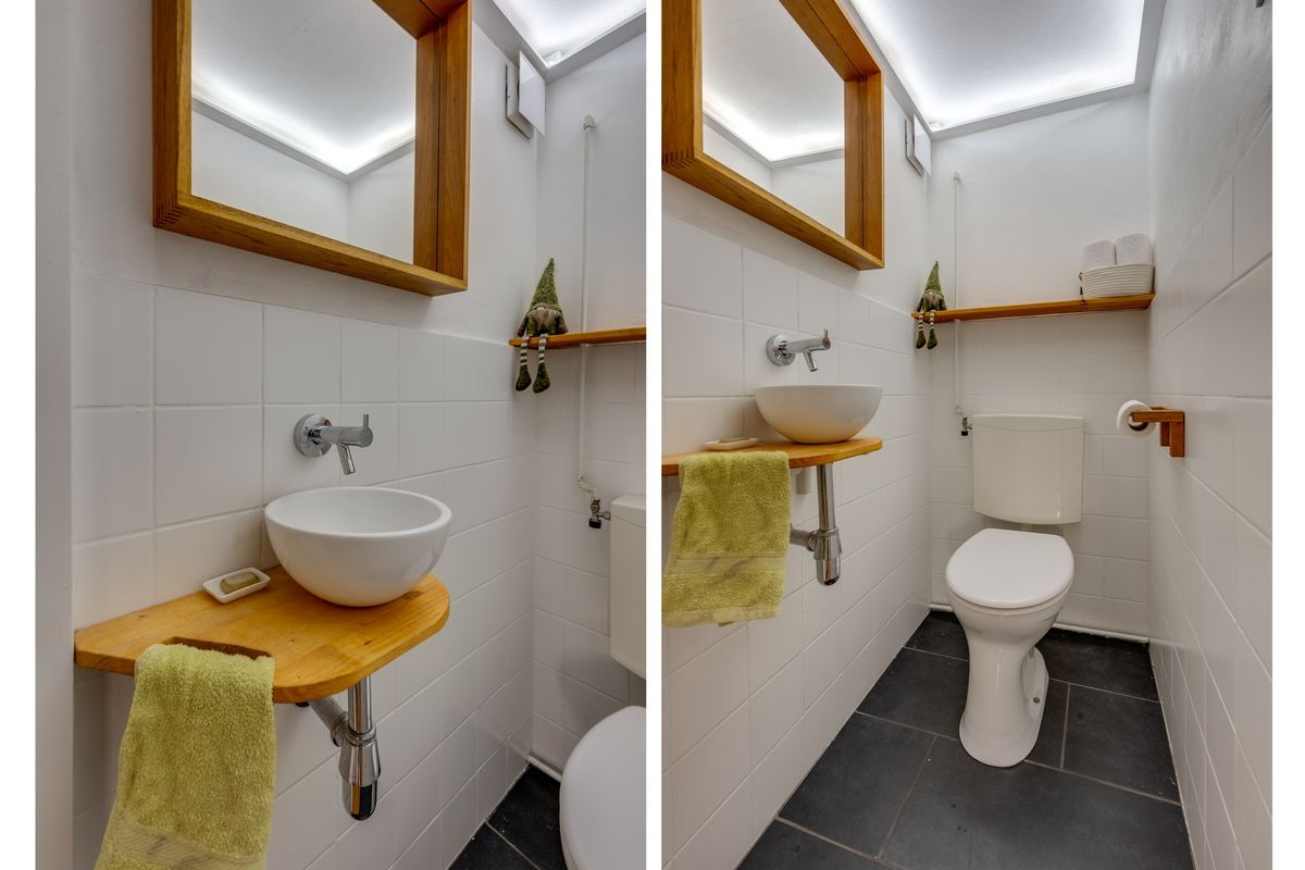 De badkamer (2,15 m. x 1,81 m.) ligt aan de voorzijde van de woning. Er is ligbad, een wastafel en een staand toilet. De badkamer is geheel betegeld. Het kunststof kozijn is v.v. HR++ melkglas.