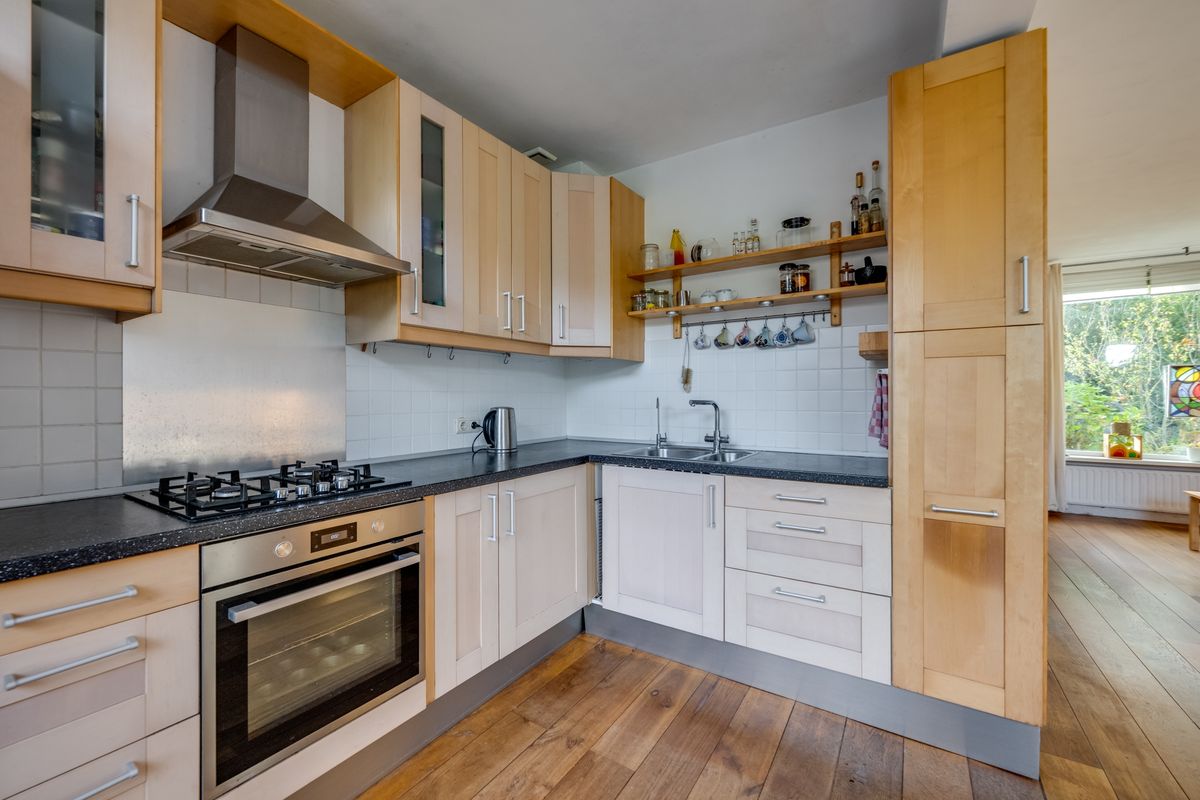De half open keuken (3,40 m. x 2,21 m.) ligt aan de achterzijde van de woning en bestaat uit een keukenblok in hoekopstelling voorzien van een 4- pits gaskookplaat, een oven, een rvs afzuigkap en enkele gootsteen. De houten vloer is doorgetrokken naar de keuken. Vanuit de keuken kunt u naar de achtertuin.