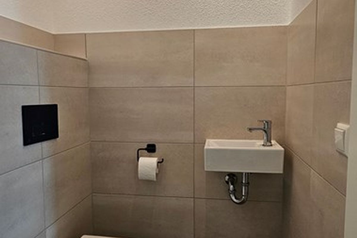 The property features two bedrooms. The master bedroom is stylishly and calmly furnished. The second room is currently set up as a home office and can easily be used as a workspace or guest room. The bathroom is modern and fitted with a walk in shower and washbasin cabinet. In addition, there is a separate toilet and a practical laundry room.