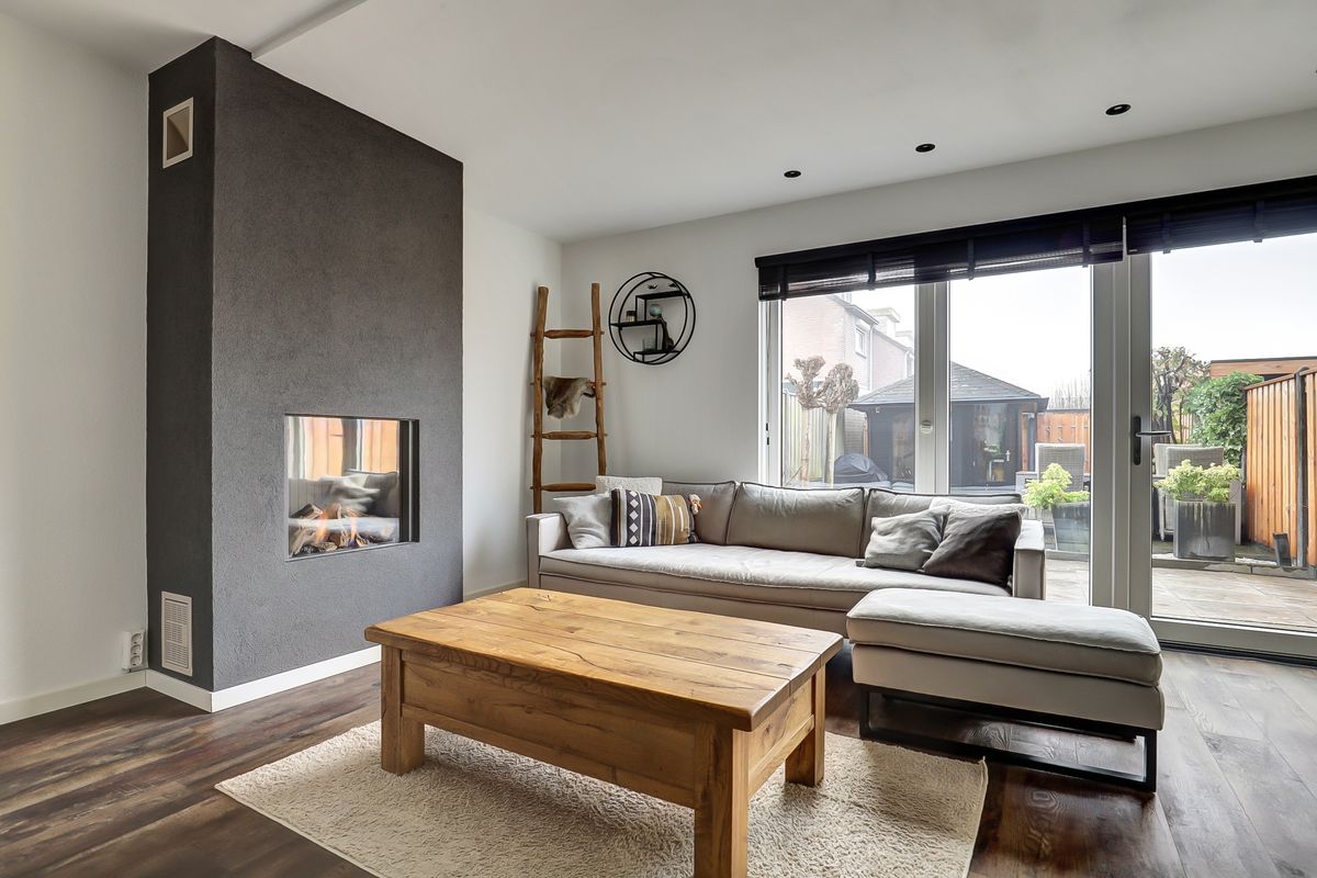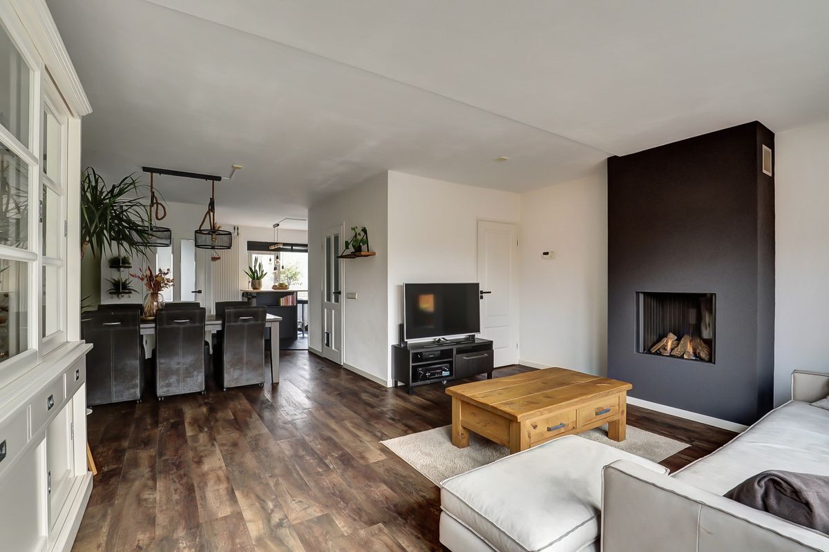 De woonkamer is verrassend ruim en baadt in daglicht dankzij de grote raampartijen. De royale aanbouw aan de achterzijde vergroot niet alleen het woonoppervlakte, maar versterkt ook het gevoel van openheid en wooncomfort. De sfeervolle zithoek bij de openslaande deuren vormt een prachtige verbinding met de tuin en creëert een warme, uitnodigende ambiance.