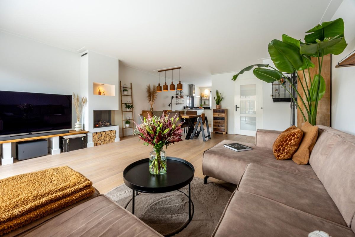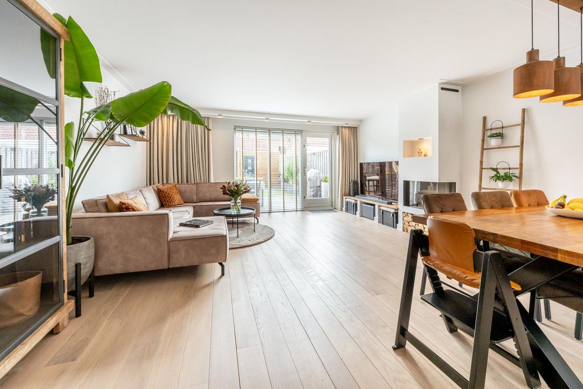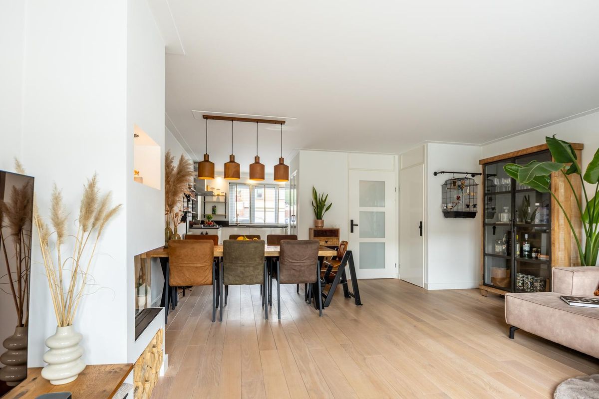 Je komt binnen in de hal met meterkast, toiletruimte en trapopgang naar de eerste verdieping. Vanuit de hal stap je de woonkamer binnen. De woonkamer is ruim opgezet, heeft een gashaard en grote ramen aan de achterzijde waardoor veel licht binnenvalt. Op de vloer ligt eikenhout. de wanden zijn gestuct en een mooie stucplint op het plafond zorgt voor een strakke afwerking. Vanuit de uitgebouwde woonkamer is er toegang tot de achtertuin.